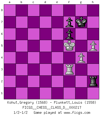 Last move : 1/2-1/2 2016 April 2 19:43:42 [Event "FICGS__CHESS__CLASS_D__000217"] [Site "FICGS"] [Date "2015.06.05"] [Round "1"] [White "Kohut,Gregory"] [Black "Plunkett,Louis"] [Result "1/2-1/2"] [WhiteElo "1568"] [BlackElo "1558"] 1.d4 d5 2.c4 Nc6 3.Nc3 Nf6 4.cxd5 Nxd5 5.e4 Nxc3 6.bxc3 e5 7.d5 Nb8 8.Bc4 Qh4 9.Qe2 Bg4 10.Nf3 Qf6 11.h3 Bxf3 12.Qxf3 a6 13.Qxf6 gxf6 14.Bd2 Nd7 15.Ke2 Rg8 16.g4 Bc5 17.Rab1 b5 18.Bd3 Ba7 19.c4 bxc4 20.Bxc4 Bd4 21.Be3 Ke7 22.Bxd4 exd4 23.Rhd1 Ne5 24.Rxd4 Rgb8 25.Rxb8 Rxb8 26.Bxa6 Rb2+ 27.Rd2 Rb4 28.Bd3 c5 29.dxc6 Nxc6 30.Ke3 Ke6 31.Rc2 Ne5 32.Rd2 Ke7 33.f4 Ng6 34.a3 Rb3 35.Ra2 Nxf4 36.Kxf4 Rxd3 37.a4 Kd7 38.h4 Rd1 39.Ra3 Kc6 40.a5 Rf1+ 41.Rf3 Rd1 42.Kf5 Rd6 43.Rb3 Kd7 44.Ra3 Ra6 45.Rd3+ Ke7 46.Rd5 Rc6 47.Kf4 Re6 48.Rh5 Ra6 49.Rxh7 Rxa5 50.Rh8 Ra1 51.h5 Rf1+ 52.Kg3 Re1 53.Kf3 Rf1+ 54.Ke2 Rf4 55.Rg8 Rxe4+ 56.Kf3 Re1 57.Ra8 Rh1 58.Ra2 Kf8 59.Rf2 Kg7 60.Kf4 Rh4 61.Kf5 Rh1 62.Rf4 Rh2 63.Rf3 Rh1 64.Rf4 Rh2 65.Rf3 1/2-1/2 QGD : Chigorin defense 10 pieces endgame at move 49 : White KRPPPP , Black KRPP WHITE : King + 1 Rook 4 Pawns BLACK : King + 1 Rook 2 Pawns 9 pieces endgame at move 49 : White KRPPP , Black KRPP WHITE : King + 1 Rook 3 Pawns BLACK : King + 1 Rook 2 Pawns 8 pieces endgame at move 55 : White KRPP , Black KRPP WHITE : King + 1 Rook 2 Pawns BLACK : King + 1 Rook 2 Pawns This chess game ended in a draw. Follow this game move after move (download)Chess is thirty to forty percent psychology. You don't have this when you play a computer. I can't confuse it. (Judith Polgar) Spielt Blackmar-Diemer-Gambit, und das Matt kommt von selbst! (Emil Joseph Diemer) Evita las multitudes. Haz independientemente tu propio razonamiento. Trata de ser el jugador de Ajedrez, no la pieza de Ajedrez. (Ralph Charell) Toute estimation doit être constamment réévaluée. (Jacob Estrin) You think that education is too expensive ? Try ignorance. (Derek Bok)