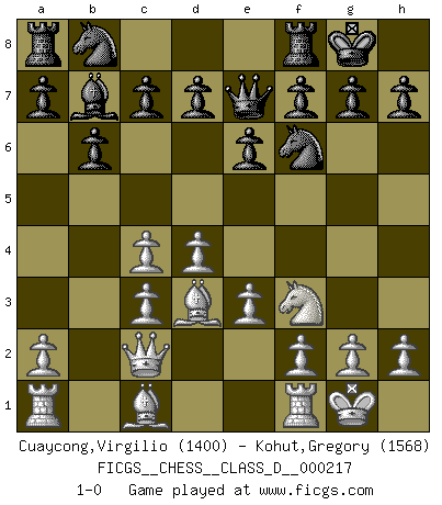 Last move : 1-0 2015 July 20 6:18:51 [Event "FICGS__CHESS__CLASS_D__000217"] [Site "FICGS"] [Date "2015.06.05"] [Round "1"] [White "Cuaycong,Virgilio"] [Black "Kohut,Gregory"] [Result "1-0"] [WhiteElo "1400"] [BlackElo "1568"] 1.d4 Nf6 2.c4 e6 3.Nf3 Bb4+ 4.Nc3 O-O 5.e3 b6 6.Bd3 Bb7 7.O-O Bxc3 8.bxc3 Qe7 9.Qc2 1-0 This chess game has been lost on time (started : 2015.06.05 23:11:17) Bogo-Indian defense Kingside Castling by player Black (move 4) Kingside Castling by player White (move 7) Player White won this chess game. Follow this game move after move (download)You need not play well - just help your opponent to play badly. (Genrikh Chepukaitis) Ich hatte meine größten Erfolge, als ich 47 Jahre alt war. Kasparow war noch nicht mal 42 und hat das Schach schon im Stich gelassen. (Viktor Kortschnoi) Cuando no sepas que mover, espera por una idea que se le venga a la la cabeza de tu oponente. Tenlo por seguro de que esa idea estará incorrecta. (Siegbert Tarrasch) Les Echecs, c'est l'art de la guerre sans les charniers, c'est la résurrection des morts tombés au champ d'honneur, l'espoir perpétuel, la suprématie de l'intelligence sur la force, la culture de l'esprit. (F. Szpiner) Life is pleasant. Death is peaceful. It's the transition that's troublesome. (Isaac Asimov)