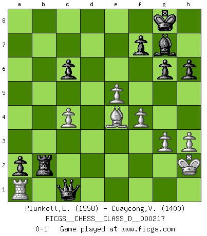 Last move : 0-1 2015 August 17 13:21:32 [Event "FICGS__CHESS__CLASS_D__000217"] [Site "FICGS"] [Date "2015.06.05"] [Round "1"] [White "Plunkett,Louis"] [Black "Cuaycong,Virgilio"] [Result "0-1"] [WhiteElo "1558"] [BlackElo "1400"] 1.Nf3 Nf6 2.c4 g6 3.g3 Bg7 4.Nc3 O-O 5.Bg2 d6 6.O-O e5 7.d3 Nc6 8.a3 a5 9.h3 h6 10.e3 Be6 11.Kh2 d5 12.cxd5 Nxd5 13.Nxd5 Bxd5 14.e4 Be6 15.Be3 Qd7 16.Rc1 Rfd8 17.Rc3 Nd4 18.Bxd4 exd4 19.Rc1 Qb5 20.Qe2 c6 21.Nd2 Qxb2 22.Rb1 Qxa3 23.Rxb7 Rdb8 24.Rfb1 Rxb7 25.Rxb7 a4 26.f4 Qc5 27.Bf3 a3 28.Rb1 a2 29.Ra1 Qc3 30.Qd1 Rb8 31.Nc4 Bxc4 32.dxc4 Rb2+ 33.Bg2 d3 34.e5 Qc2 35.Qxc2 dxc2 36.Be4 c1Q 0-1 Reti Opening Kingside Castling by player Black (move 4) Kingside Castling by player White (move 6) Promotion Queen by player Black (move 36) Player Black won this chess game. Follow this game move after move (download)If your opponent offers you a draw, try to work out why he thinks he's worse off. (Nigel Short) Um sich vor der Gefahr einer Erkältung zu schützen, sorge der wanderlustige König beizeiten für ein brauchbares Versteck. (Aaron Nimzowitsch) Desconfianza es la característica mas necesaria de un jugador de Ajedrez. (Siegbert Tarrasch) J'ai vu le vaincu d'Echecs jouer des années durant dans l'espoir de la fête de la victoire. Car tu es plus riche de ce qu'elle existe si même elle n'est point pour toi. Ainsi de la perle du fond des mers. (Antoine de Saint-Exupéry) Macintosh - we might not get everything right, but at least we knew the century was going to end. (Douglas Adams)