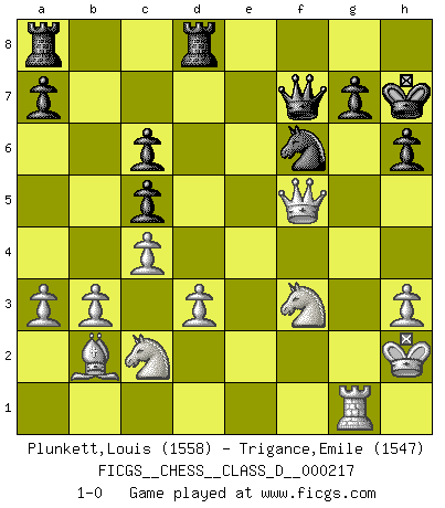 Last move : 1-0 2015 August 10 12:55:23 [Event "FICGS__CHESS__CLASS_D__000217"] [Site "FICGS"] [Date "2015.06.05"] [Round "1"] [White "Plunkett,Louis"] [Black "Trigance,Emile"] [Result "1-0"] [WhiteElo "1558"] [BlackElo "1547"] 1.Nf3 d5 2.c4 d4 3.g3 c5 4.d3 Nc6 5.Bg2 e5 6.O-O Nf6 7.a3 Be7 8.Nbd2 O-O 9.h3 h6 10.Re1 Be6 11.Kh2 Nd7 12.Ne4 f5 13.Ned2 Qe8 14.Nf1 Qh5 15.e3 dxe3 16.Nxe3 Nf6 17.Ng1 Qf7 18.Nc2 Nd7 19.f4 Bd6 20.Bxc6 bxc6 21.Rb1 Rfd8 22.b3 Bc7 23.Qf3 exf4 24.gxf4 Nb8 25.Bb2 Bd6 26.Qg3 Kh7 27.Rxe6 Bxf4 28.Qxf4 Qxe6 29.Re1 Qf7 30.Nf3 Nd7 31.Rg1 Nf6 32.Qxf5+ 1-0 Reti : Advance variation Kingside Castling by player White (move 6) Kingside Castling by player Black (move 8) Player White won this chess game. Follow this game move after move (download)The only thing Chess players have in common is Chess. (Lodewijk Prins) Vielleicht wirkt die Aura früherer Spieler glanzvoller als die der heutigen Spieler, aber das liegt daran, dass man kein Programm wie Fritz hatte, das einem all die Löcher in ihren Partien zeigt. (Vladimir Kramnik) Aunque la mayoría de la gente disfruta observar las partidas de los grandes Maestros de ataque, algunos de los jugadores mas notables en la historia han sido los jugadores silenciosos posicionales. Lentamente ellos te aplastan despojandote de tu espacio, congestionando tus piezas y dejandote virtualmente sin nada que hacer. (Yasser Seirawan) Mais n'est-ce pas déjà le limiter injurieusement que d'appeler les échecs un jeu? N'est-ce pas aussi une science, un art, ou quelque chose qui, comme le cercueil de Mahomet entre ciel et terre, est suspendu entre l'un et l'autre, et qui réunit un nombre incroyable de contraires ? (Stefan Zweig) To err is human, but to really foul things up requires a computer. (Farmer's Almanac, 1978)