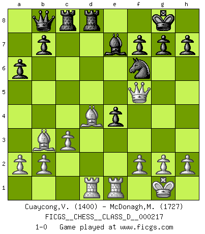 Last move : 1-0 2015 September 5 22:32:31 [Event "FICGS__CHESS__CLASS_D__000217"] [Site "FICGS"] [Date "2015.06.05"] [Round "1"] [White "Cuaycong,Virgilio"] [Black "McDonagh,Michael"] [Result "1-0"] [WhiteElo "1400"] [BlackElo "1727"] 1.d4 e6 2.e4 d5 3.Nd2 c5 4.exd5 Qxd5 5.Ngf3 cxd4 6.Bc4 Qd6 7.O-O Nf6 8.Nb3 Nc6 9.Nbxd4 Nxd4 10.Nxd4 Be7 11.c3 O-O 12.Qf3 Rd8 13.Re1 e5 14.Nf5 Bxf5 15.Qxf5 e4 16.Be3 Rac8 17.Bb3 a6 18.Rad1 Qb8 19.Bd4 1-0 This chess game has been lost on time (started : 2015.06.05 23:11:17) Queen's pawn Kingside Castling by player White (move 7) Kingside Castling by player Black (move 11) Player White won this chess game. Follow this game move after move (download)Chess is a beautiful mistress. (Bent Larsen) Je älter ich werde, um so mehr schätze ich die Bauern. (Paul Keres) Un buen jugador siempre tiene buena suerte. (José Raúl Capablanca) Les ravages du H expliquent la différence de niveau entre Tal et Thal [Abergel]. You know what they say : You lie down with the Devil, you wake up in Hell. (Horatio Caine, C.S.I. Miami)
