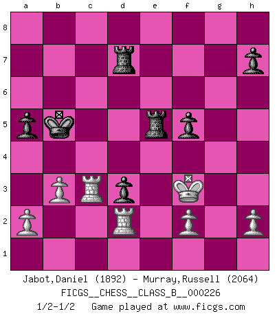 Last move : 1/2-1/2 2016 February 18 19:12:52 [Event "FICGS__CHESS__CLASS_B__000226"] [Site "FICGS"] [Date "2015.06.06"] [Round "1"] [White "Jabot,Daniel"] [Black "Murray,Russell"] [Result "1/2-1/2"] [WhiteElo "1892"] [BlackElo "2064"] 1.e4 c6 2.d4 d5 3.exd5 cxd5 4.c4 Nf6 5.Nc3 Nc6 6.Nf3 Bg4 7.cxd5 Nxd5 8.Qb3 Bxf3 9.gxf3 e6 10.Qxb7 Nxd4 11.Bb5+ Nxb5 12.Qc6+ Ke7 13.Qxb5 Qd7 14.Nxd5+ Qxd5 15.Qxd5 exd5 16.O-O Rd8 17.Rd1 d4 18.Bf4 Ke6 19.Rac1 g5 20.Be3 Bg7 21.Rc6+ Kd5 22.Ra6 Be5 23.Ra4 Kc6 24.Rc4+ Kb5 25.Rdc1 Rd5 26.Bd2 Ka6 27.Kg2 f6 28.f4 gxf4 29.Kf3 Re8 30.b3 d3 31.Rb4 Rb5 32.Ra4+ Kb6 33.Rd1 Rd8 34.Bxf4 Bxf4 35.Rxf4 f5 36.Rd2 a5 37.Rh4 Rc5 38.Ke3 Re5+ 39.Kf3 Rd7 40.Rc4 Red5 41.Rc3 Kb5 42.Ke3 Re5+ 43.Kf3 Red5 44.Ke3 Re5+ 45.Kf3 1/2-1/2 Caro-Kann : Panov-Botvinnik attack Kingside Castling by player White (move 16) This chess game ended in a draw. Follow this game move after move (download)First-class players lose to second class players because second-class players sometimes play a first-class game. (Tarrasch) Es ist nicht das erste mal, dass sich die FIDE dem Arabischen Geld gebeugt hat (über die FIDE WM 2004 in Lybien). (Larry Evans) Te sientas frente a un tablero y repentinamente tu corazón brinca. Tu mano tiembla al tomar una pieza y moverla. Pero lo que el Ajedrez te enseña es que tu debes permanecer ahí con calma y pensar de que si realmente es una buena idea o de que si hay otras ideas mejores. (Stanley Kubrick) RxDa4 pat (...) Good decisions come from experience, and experience comes from bad decisions. (Anonymous)