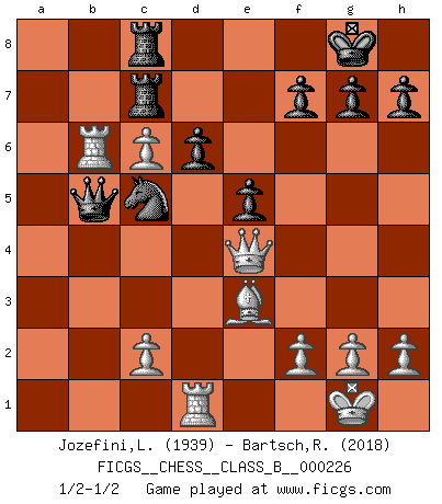 Last move : 1/2-1/2 2015 September 3 12:12:52 [Event "FICGS__CHESS__CLASS_B__000226"] [Site "FICGS"] [Date "2015.06.06"] [Round "1"] [White "Jozefini,Lubor"] [Black "Bartsch,Reinhard Andrea"] [Result "1/2-1/2"] [WhiteElo "1939"] [BlackElo "2018"] 1.e4 c5 2.Nf3 d6 3.d4 cxd4 4.Nxd4 Nf6 5.Nc3 a6 6.Bc4 e6 7.Bb3 b5 8.Qf3 Bb7 9.O-O Nbd7 10.Re1 Nc5 11.Bd5 Nxd5 12.exd5 b4 13.Nc6 Qb6 14.Ne2 Bxc6 15.dxc6 Be7 16.Nd4 O-O 17.Nf5 Rae8 18.Nxe7+ Rxe7 19.a3 Rc7 20.axb4 Qxb4 21.Bf4 e5 22.Be3 Ne6 23.Red1 Qxb2 24.Qe4 Rfc8 25.Rxa6 Qb5 26.Rb6 Nc5 1/2-1/2 Sicilian : Najdorf, Lipnitzky attack Kingside Castling by player White (move 9) Kingside Castling by player Black (move 16) This chess game ended in a draw. Follow this game move after move (download)A Chess game is divided into three stages: the first, when you hope you have the advantage, the second when you believe you have an advantage, and the third... when you know you're going to lose ! (Savielly Tartakower) Ich verachte die Medien. (Robert James Fischer) En manos de Fischer's, una diminuta ventaja teórica es tan buena como tener una Reina de ventaja. (Isaac Kashdan) Pour se monter efficace, un Cavalier a besoin d'avant-postes ! Les Cavaliers font les meilleurs bloqueurs de pions passés. Man with more than one clock never knows what time it is. (Chinese thought)
