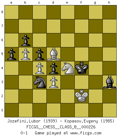 Last move : 0-1 2016 August 5 14:10:11 [Event "FICGS__CHESS__CLASS_B__000226"] [Site "FICGS"] [Date "2015.06.06"] [Round "1"] [White "Jozefini,Lubor"] [Black "Kopasov,Evgeny"] [Result "0-1"] [WhiteElo "1939"] [BlackElo "1985"] 1.Nf3 Nf6 2.b4 e6 3.a3 d5 4.e3 Be7 5.Bb2 O-O 6.c4 a5 7.b5 Nbd7 8.Qc2 c5 9.d3 b6 10.Be2 Bb7 11.Nbd2 Ne8 12.O-O Bf6 13.Rac1 Nd6 14.a4 Rc8 15.Rfd1 Qe7 16.Qb1 Rfd8 17.Qa1 Bxb2 18.Qxb2 d4 19.exd4 Nf5 20.d5 exd5 21.Re1 d4 22.Bf1 Qf8 23.g3 Nd6 24.Qb3 Re8 25.Bh3 Rxe1+ 26.Rxe1 Re8 27.Qd1 Re7 28.Bg2 Qe8 29.Rxe7 Qxe7 30.Nh4 Bc8 31.Qf3 Qe1+ 32.Nf1 Bb7 33.Qf4 Qe5 34.Qd2 Bc8 35.f4 Qe6 36.Nf3 h6 37.Kf2 Nf8 38.Qe1 Qxe1+ 39.Nxe1 g5 40.fxg5 hxg5 41.Nd2 Ng6 42.Ne4 Nxe4+ 43.Bxe4 Kg7 44.Nf3 f5 45.Bd5 g4 46.Ng5 Ne5 47.Ke2 Kf6 48.Nh7+ Ke7 49.Ng5 f4 50.gxf4 Ng6 51.Be4 Nxf4+ 52.Ke1 Kf6 53.Nh7+ Kg7 54.Ng5 Kh6 55.Nf7+ Kh5 56.Nd6 Be6 57.Kf2 Kh4 58.Kg1 Kh3 59.Kh1 g3 60.hxg3 Kxg3 61.Kg1 Bh3 62.Kh1 Ne2 63.Bd5 Nc3 64.Ne4+ Kf4 65.Kg1 Nxa4 66.Kf2 Nc3 0-1 Reti Opening Kingside Castling by player Black (move 5) Kingside Castling by player White (move 12) Player Black won this chess game. Follow this game move after move (download)Modern Chess is too much concerned with things like Pawn structure. Forget it, Checkmate ends the game. (Nigel Short) Glücklicherweise sind Großmeister Ruben Fines reine Schachbücher weniger phallozentrisch [als seine Schachpsychologie] und deswegen auch weniger lächerlich. (Nigel Short) Una mala movida nulifica cuarenta buenas. (Horowitz) Les Echecs représentent une sphère d'idées créatrices basée sur la volonté des deux protagonistes. (Smyslov) Before all elsed, be armed. (Niccolo Machiavelli)