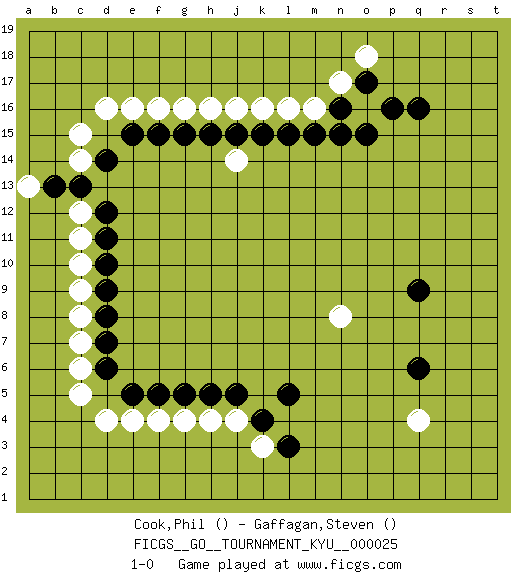 Last move : 1-0 2007 June 5 12:20:32 [Event "FICGS__GO__TOURNAMENT_KYU__000025 "] [Site "FICGS"] [Date "2007.03.04"] [Round "1"] [Black "Cook,Phil "] [White "Gaffagan,Steven "] [Result "1-0"] 1.q16 d4 2.d7 d16 3.d14 q4 4.q6 n8 5.q9 e16 6.e15 g16 7.g15 f16 8.f15 h16 9.h15 j16 10.k15 l16 11.m15 j14 12.j15 k16 13.l15 n17 14.n16 o16 15.o15 m16 16.n15 c15 17.o17 o18 18.p16 c14 19.c13 c12 20.d12 c11 21.d11 c10 22.d10 c9 23.d9 c8 24.d8 c7 25.d6 c6 26.e5 e4 27.f5 f4 28.g5 g4 29.j5 h4 30.h5 c5 31.b13 a13 32.l5 j4 33.k4 k3 34.l3 1-0 This go game has been lost on time (started : 2007.03.04 15:36:14) Here are the names of the openings (joseki) played in the four corners : Corner d4 : d4 d7Hoshi (Hwajeom, Seongjeom, Xingwei`) 4-4 Point. The star or hoshi (4-4) point, emphasizing influence at the potential expense of territory.Nikken Takagakari (Dukan Nop'dakeolch'im, E`r Gaojia, 2-Space High Approach). Black 2 is a light approach move. Rarely played in even games, Black 2 is typically employed in handicap games. White continues with 6-4 or 3-10. In Korean Sunjang Baduk White has a stone on 8-4. Corner d16 : d16 d14Hoshi (Hwajeom, Seongjeom, Xingwei`) 4-4 Point. The star or hoshi (4-4) point, emphasizing influence at the potential expense of territory.Ikken Takagakari (Hankan Nop'dakeolch'im, Yi Gaojia, 1-Space High Approach). White typically responds at 6-4 or 3-10. White 4-10 is played when White finds play on the right side advantageous. White 4-8 or 3-8 may be played when White has support at top. Corner q4 : q4 q6Hoshi (Hwajeom, Seongjeom, Xingwei`) 4-4 Point. The star or hoshi (4-4) point, emphasizing influence at the potential expense of territory.Ikken Takagakari (Hankan Nop'dakeolch'im, Yi Gaojia, 1-Space High Approach). White typically responds at 6-4 or 3-10. White 4-10 is played when White finds play on the right side advantageous. White 4-8 or 3-8 may be played when White has support at top. Corner q16 : q16 l16Hoshi (Hwajeom, Seongjeom, Xingwei`) 4-4 Point. The star or hoshi (4-4) point, emphasizing influence at the potential expense of territory. Player Black won this Go (weiqi, baduk) game.Follow this game move after move (download ) Big groups never die. (Anonymous) I have opinions of my own - strong opinions - but I don't always agree with them. (George Bush)