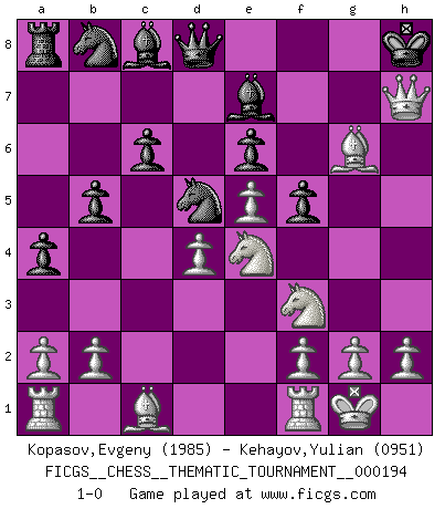 Last move : 1-0 2015 June 17 11:20:28 [Event "FICGS__CHESS__THEMATIC_TOURNAMENT__000194"] [Site "FICGS"] [Date "2015.06.11"] [Round "1"] [White "Kopasov,Evgeny"] [Black "Kehayov,Yulian"] [Result "1-0"] [WhiteElo "1985"] [BlackElo "0951"] 1.d4 d5 2.c4 e6 3.Nc3 c6 4.Nf3 dxc4 5.e3 Nf6 6.Bxc4 Be7 7.O-O O-O 8.e4 b5 9.Bd3 a5 10.Qc2 a4 11.e5 Nd5 12.Bxh7+ Kh8 13.Ne4 g6 14.Qd2 f5 15.Qh6 Rf7 16.Bxg6 Rh7 17.Qxh7+ 1-0 QGD : Semi-Slav, Noteboom variation Kingside Castling by player White (move 7) Kingside Castling by player Black (move 7) Player White won this chess game. Follow this game move after move (download)My opponents make good moves too. Sometimes I don't take these things into consideration. (Bobby Fischer) Der Bart als Geschlechtszeichen mitten im Gesicht ist obszön. Daher gefällt er den Weibern. [Zugegeben, kein Schachzitat, aber unglaublich originell] (Arthur Schopenhauer) El juego de Damas es para vagabundos. (Paul Morphy) J'apprécie les joueurs d'est-indienne, c'est grâce à eux que je nourris ma famille depuis tant d'années. (Petrosian) Two beer, or not two beer. (Unknown)