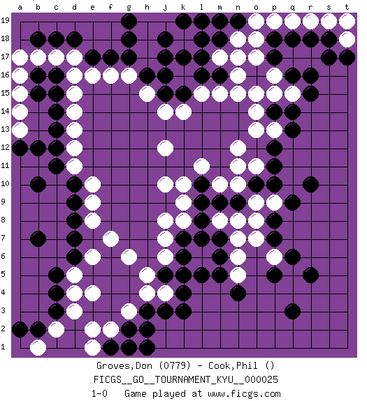 Last move : 1-0 2007 April 29 10:19:56 [Event "FICGS__GO__TOURNAMENT_KYU__000025"] [Site "FICGS"] [Date "2007.03.04"] [Round "1"] [Black "Groves,Don"] [White "Cook,Phil"] [Result "1-0"] [Rating 1 "0779"] 1.q3 d16 2.r16 p16 3.q14 o15 4.p17 o17 5.p18 n18 6.q16 q15 7.r15 p15 8.r10 d3 9.d10 d11 10.c11 d12 11.c12 d13 12.c13 d14 13.c15 d15 14.c5 d5 15.d6 e4 16.c4 d4 17.c3 e2 18.k3 h4 19.k4 e6 20.d7 f7 21.r5 g6 22.j17 k16 23.e17 h17 24.h16 g16 25.g17 e16 26.f17 f16 27.c16 d17 28.d18 c17 29.c18 b17 30.b16 a16 31.c14 a14 32.b15 a15 33.a12 h18 34.j18 j19 35.g18 h19 36.k19 e10 37.d9 e8 38.d8 e9 39.p10 n10 40.l10 n8 41.l8 j8 42.k7 n6 43.n4 n12 44.p12 o13 45.p14 o14 46.p8 o7 47.m7 n7 48.n9 o9 49.m9 o8 50.o10 n11 51.p7 p6 52.q6 p9 53.q9 m8 54.m6 m10 55.l9 j10 56.j15 j12 57.k15 l15 58.l16 m15 59.m16 n15 60.m18 m17 61.l17 n17 62.l18 l11 63.p5 n5 64.m5 j6 65.k6 j7 66.h3 g3 67.h2 g1 68.g2 p13 69.q13 h15 70.j16 j14 71.k17 k14 72.f1 f2 73.h1 j4 74.b18 a17 75.b10 e1 76.j3 k5 77.l5 k8 78.g1 k10 79.j5 h5 80.k5 o11 81.p11 m19 82.l19 k9 83.l7 c2 84.b2 n16 85.g19 a13 86.b12 b1 87.a2 o18 88.n19 o19 89.m19 p19 90.q18 q19 91.r18 r19 92.s18 s19 93.b7 t18 94.t17 t19 95.s17 1-0 Here are the names of the openings (joseki) played in the four corners : Corner q16 : r16 p16 Komoku (Somok, Xiao~mu`) 3-4 Point. The komoku (3-4) point is the traditional corner enclosure move.. Ikken Takagakari (Hankan Nop'dakeolch'im, Yi Gaogua`jiao~, 1-Space High Approach). The 5-4 approach move has become more popular in modern times, as modern Go emphasizes speed and influence. Corner d4 : d3 c5 Komoku (Somok, Xiao~mu`) 3-4 Point. The komoku (3-4) point is the traditional corner enclosure move.. Ikken Kakari (Hankan Keolch'im, Yi Gua`jiao~, 1-Space Low Pincer). The small knight move is the basic approach move to the 3-4 point stone. It has been continually used for over four centuries. There are limitless variations, with new moves constantly being discovered. Black 2 opens the door to a treaure store of joseki. Player Black won this Go (weiqi, baduk) game. Follow this game move after move (download)Be a little patient. Keshi works ! (Anonymous) You think that education is too expensive ? Try ignorance. (Derek Bok)