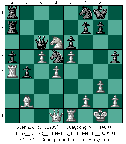Last move : 1/2-1/2 2015 July 4 17:16:17 [Event "FICGS__CHESS__THEMATIC_TOURNAMENT__000194"] [Site "FICGS"] [Date "2015.06.11"] [Round "1"] [White "Sternik,Ryszard"] [Black "Cuaycong,Virgilio"] [Result "1/2-1/2"] [WhiteElo "1789"] [BlackElo "1400"] 1.d4 d5 2.c4 e6 3.Nc3 c6 4.Nf3 dxc4 5.e3 b5 6.a4 Bb4 7.Bd2 a5 8.axb5 Bxc3 9.Bxc3 cxb5 10.b3 Bb7 11.bxc4 b4 12.Bb2 Nf6 13.Bd3 Nbd7 14.O-O O-O 15.Nd2 Qc7 16.Bc2 Rfc8 17.c5 Bc6 18.Re1 Rd8 19.e4 Ra7 20.e5 Nd5 21.Ne4 Rda8 22.Nd6 Nf8 23.Ba4 Bxa4 24.Rxa4 Qc6 25.g3 h5 1/2-1/2 QGD : Semi-Slav, Noteboom variation Kingside Castling by player White (move 14) Kingside Castling by player Black (move 14) This chess game ended in a draw. Follow this game move after move (download)Botvinnik tried to take the mystery out of Chess, always relating it to situations in ordinary life. He used to call Chess a typical inexact problem similar to those which people are always having to solve in everyday life. (Garry Kasparov) Über Kasparov: Es ist offensichtlich, daß er in einem totalitären Staat aufwuchs und deshalb zu diktatorischen Zügen neigt. (Viktor Kortschnoi) La pasion por jugar al Ajedrez es una de las mas inexplicables en el mundo. (H.G. Wells) Il n'y a pas de prix trop élevé au scalp de l'ennemi. (Koblentz) Art is the only way to run away without leaving home. (Twyla Tharp)