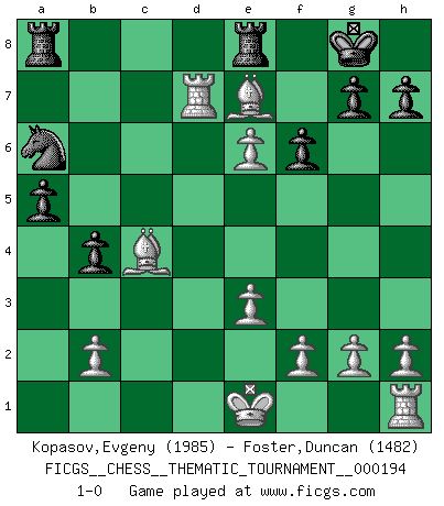 Last move : 1-0 2015 June 24 13:0:30 [Event "FICGS__CHESS__THEMATIC_TOURNAMENT__000194"] [Site "FICGS"] [Date "2015.06.11"] [Round "1"] [White "Kopasov,Evgeny"] [Black "Foster,Duncan"] [Result "1-0"] [WhiteElo "1985"] [BlackElo "1482"] 1.d4 d5 2.c4 e6 3.Nc3 c6 4.Nf3 dxc4 5.e3 b5 6.a4 Bb4 7.Bd2 Bb7 8.axb5 Bxc3 9.Bxc3 cxb5 10.d5 f6 11.dxe6 Qxd1+ 12.Rxd1 Ne7 13.Be2 a5 14.Nd4 b4 15.Nb5 O-O 16.Bd4 Na6 17.Nd6 Bd5 18.Nxc4 Bxc4 19.Bxc4 Nc7 20.Bc5 Rfe8 21.Rd7 Na6 22.Bxe7 1-0 QGD : Semi-Slav, Noteboom variation Kingside Castling by player Black (move 15) Player White won this chess game. Follow this game move after move (download)There is only one thing Fischer does in Chess without pleasure: to lose ! (Boris Spassky) Wenn Du nicht kämpfst, um anderen etwas zu beweisen, sondern nur für Dich selbst, dann bist du fast unbesiegbar. (Garry Kasparov) Si un gobernante no entiende al Ajedrez, ¿como puede governar él un reinado?. (El Rey Khusros II) Même un GMI sait rarement calculer sur plus de cinq coups une attaque à sacrifices. (Rudolf Spielmann) The only thing that overcomes hard luck is hard work. (Harry Golden)