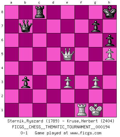 Last move : 0-1 2015 June 30 14:35:1 [Event "FICGS__CHESS__THEMATIC_TOURNAMENT__000194"] [Site "FICGS"] [Date "2015.06.11"] [Round "1"] [White "Sternik,Ryszard"] [Black "Kruse,Herbert"] [Result "0-1"] [WhiteElo "1789"] [BlackElo "2404"] 1.d4 d5 2.c4 e6 3.Nc3 c6 4.Nf3 dxc4 5.e3 b5 6.a4 Qb6 7.axb5 cxb5 8.b3 Bb4 9.Qc2 Nf6 10.bxc4 bxc4 11.Ba3 Qa5 12.Bb2 Qc7 13.Be2 a5 14.O-O O-O 15.Nb5 Qe7 16.Ne5 Ba6 17.Nc3 Rc8 18.h4 Nbd7 19.Bf3 Nd5 20.Nxd5 exd5 21.Bc3 Nxe5 22.dxe5 Bb7 23.g3 d4 24.Bxb4 axb4 25.Rxa8 Rxa8 26.Bxb7 Qxb7 27.Qxc4 dxe3 28.fxe3 b3 29.e6 fxe6 30.Qxe6+ Kh8 31.Qe5 h6 32.h5 Rc8 0-1 QGD : Semi-Slav, Noteboom variation Kingside Castling by player White (move 14) Kingside Castling by player Black (move 14) Player Black won this chess game. Follow this game move after move (download)My style is somewhere between that of Tal and Petrosian. (Reshevsky) Es ist besser die Steine des Gegners zu opfern. (Savielly Grigorievitsch Tartakower) Las combinaciones han sido siempre el aspecto más intrigante del Ajedrez. Los Maestros las buscan, el público las aplauden, los críticos las alaban. La razón se debe a que las combinaciones hacen posible que el Ajedrez sea más que un ejercicio matemático con una carencia de vida. Ellas son la poesía del juego, son del Ajedrez lo que la melodía es de la música. Ellas representan el triunfo de la mente sobre la materia. (Reuben Fine) Si je n'étais pas joueur d'échecs, je serais le meilleur dans quelque chose d'autre. (Anatoli Karpov) Good luck. You're gonna need it. (Han Solo in Star Wars ep.6)