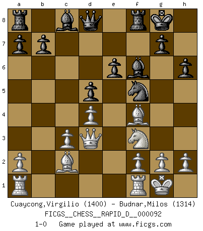 Last move : 1-0 2015 August 6 15:12:22 [Event "FICGS__CHESS__RAPID_D__000092"] [Site "FICGS"] [Date "2015.06.12"] [Round "1"] [White "Cuaycong,Virgilio"] [Black "Budnar,Milos"] [Result "1-0"] [WhiteElo "1400"] [BlackElo "1314"] 1.e4 c5 2.c3 Nf6 3.e5 Nd5 4.d4 cxd4 5.cxd4 d6 6.Nf3 e6 7.Bc4 Nc6 8.O-O Be7 9.Qe2 O-O 10.Nc3 Nxc3 11.bxc3 h6 12.Bf4 d5 13.Bd3 f5 14.exf6 Bxf6 15.Qe3 Ne7 16.Bc2 Nf5 17.Qd3 1-0 Sicilian : Alapin's variation (2.c3) Kingside Castling by player White (move 8) Kingside Castling by player Black (move 9) Player White won this chess game. Follow this game move after move (download)Fischer prefers to enter Chess history alone. (Miguel Najdorf) Lisa Lane, amerikanische Schachmeisterin, hatte Fischer einmal als stärksten lebenden Spieler bezeichnet. Antwort: Das ist richtig, aber Lisa Lane ist eigentlich nicht in der Lage, das zu beurteilen. (Robert James Fischer) El Rey es una pieza de pelea. ¡Usenlo!. (Wilhelm Steinitz) Une platitude souvent récitée à propos des Echecs est qu'une des choses les plus difficiles à réaliser est de gagner une position gagnante. Cela ne manque pas de sens mais, pour ma part, j'ai toujours trouvé plus difficile de gagner une position perdante. (Tim Krabbe) If you work for a living, why do you kill yourself working ? (Tuco to a chicken in The Good, The Bad and The Ugly)