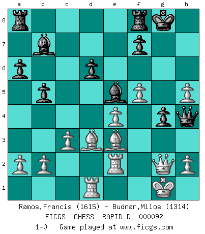 Last move : 1-0 2015 August 21 7:12:46 [Event "FICGS__CHESS__RAPID_D__000092"] [Site "FICGS"] [Date "2015.06.12"] [Round "1"] [White "Ramos,Francis"] [Black "Budnar,Milos"] [Result "1-0"] [WhiteElo "1615"] [BlackElo "1314"] 1.e4 c5 2.Nf3 d6 3.d4 cxd4 4.Nxd4 Nf6 5.Nc3 a6 6.Be3 e5 7.Nb3 Be7 8.Bd3 O-O 9.O-O Nc6 10.f4 h6 11.Qf3 Ng4 12.Bd2 Nd4 13.Nxd4 exd4 14.Nd5 Ne3 15.Nxe3 dxe3 16.Bxe3 b5 17.f5 Bf6 18.c3 Bb7 19.Rad1 Qe7 20.Bc1 Be5 21.Rfe1 Qf6 22.g4 Qh4 23.Re2 g5 24.Be3 h5 25.gxh5 g4 26.Qg2 1-0 Sicilian : Najdorf, Byrne (English) attack Kingside Castling by player Black (move 8) Kingside Castling by player White (move 9) Player White won this chess game. Follow this game move after move (download)All Chess players should have a hobby. (Savielly Tartakower) Wie bekannt hörte Morphy 1859 auf, Schach zu spielen. Seine Enttäuschung galt nicht so sehr dem Schach, wie den Schachspielern. (Robert James Fischer) Siempre es mucho mejor sacrificar las piezas de tu oponente. (Savielly Tartakover) Le thème de l'attaque double intervient d'une manière ou d'une autre dans l'immense majorité des combinaisons. (Youri Averbakh) There are two major products that came out of Berkeley: LSD and UNIX. We do not believe this is to be a coincidence. (Jeremy S. Anderson)