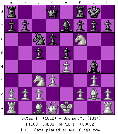 Last move : 1-0 2015 July 20 3:32:15 [Event "FICGS__CHESS__RAPID_D__000092"] [Site "FICGS"] [Date "2015.06.12"] [Round "1"] [White "Toktas,Ibrahim Ugras"] [Black "Budnar,Milos"] [Result "1-0"] [WhiteElo "1612"] [BlackElo "1314"] 1.e4 c5 2.g3 Nc6 3.Bg2 Nf6 4.Ne2 e5 5.Nbc3 Be7 6.Nd5 O-O 7.Nec3 d6 8.d3 Bg4 9.Nxf6+ 1-0 Sicilian : Steinitz variation Kingside Castling by player Black (move 6) Player White won this chess game. Follow this game move after move (download)In a gambit you give up a Pawn for the sake of getting a lost game. (Samuel Standige Boden) Sehr viele beherrschen heutzutage das große Einmalseins des Schachspiels und kennen sogar dessen Logarithmentafeln auswendig - deshalb sollte man hin und wieder zu beweisen trachten, dass zwei mal zwei auch fünf sein kann. (Mikhail Nekhemyevich Tal) ¿Quién es tu oponente esta tarde? Esta tarde mi oponente son las piezas negras. (Akiba Rubinstein) Les échecs c'est le défi de l'alpiniste, toujours plus haut, prêt à tout pour monter à l'assaut du Roi ennemi. Les échecs, c'est de la musique en mouvement, un ballet majestueux pour les yeux. C'est de la poésie composée par les fantômes du passé qui au même titre que Rimbaud ou Verlaine méritent notre admiration. Les échecs, c'est de la peinture ou le moindre mouvement modifie le tableau pour en faire un Picasso ou un Van Gogh. Les échecs, c'est tout et rien, c'est la vie et la mort. Jjulie33 sur le forum de France-Echecs. Optimism is a variety of information deficit. Sometimes especially true for correspondence chess games. (Michael Aigner)