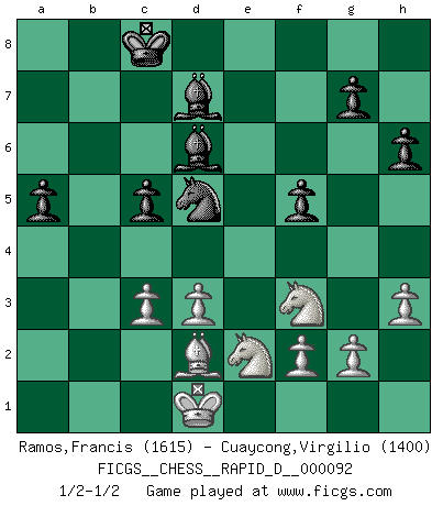 Last move : 1/2-1/2 2015 July 9 15:10:51 [Event "FICGS__CHESS__RAPID_D__000092"] [Site "FICGS"] [Date "2015.06.12"] [Round "1"] [White "Ramos,Francis"] [Black "Cuaycong,Virgilio"] [Result "1/2-1/2"] [WhiteElo "1615"] [BlackElo "1400"] 1.e4 e5 2.Nf3 Nc6 3.Bb5 f5 4.Bxc6 dxc6 5.Nxe5 Qd4 6.Nf3 Qxe4+ 7.Qe2 Qxe2+ 8.Kxe2 Be6 9.Re1 O-O-O 10.Nc3 Bd6 11.d3 Nf6 12.h3 Rhe8 13.Kf1 h6 14.Bd2 a6 15.a3 b6 16.b4 Bd7 17.Rxe8 Rxe8 18.Re1 Rxe1+ 19.Kxe1 c5 20.Ne2 cxb4 21.axb4 Nd5 22.c3 a5 23.bxa5 bxa5 24.Kd1 c5 1/2-1/2 Ruy Lopez : Schliemann defense Queenside Castling by player Black (move 9) This chess game ended in a draw. Follow this game move after move (download)I still hope to kill Fischer. (Boris Spassky) Die Arbeit ist etwas Unnatürliches. Die Faulheit allein ist göttlich. (Anatole France) El Ajedrez es en su esencia, un juego. En su forma, un arte. Y en su ejecución, una ciencia. (Baron Tassilo) Botvinnik disait en comparant les échecs à la musique: Il existe une science dont le but est l'étude de l'acoustique et des sons. Mais il y a aussi un art qui se sert de l'océan des sons : c'est la musique. De toute évidence, il en est de même pour la pensée. La logique est l'étude des lois de la réflexion et les échecs reflètent, en tant qu'art, le côté logique de la réflexion, sous la forme d'images artistiques... Extrait de Fischer - Spassky, Reykjavik 1972 par Alexander & F. Wyndham (Ed. Solar), p 37. Programmer - an organism that turns coffee into software. (Anonymous)