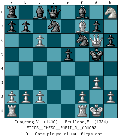 Last move : 1-0 2015 August 9 9:29:36 [Event "FICGS__CHESS__RAPID_D__000092"] [Site "FICGS"] [Date "2015.06.12"] [Round "1"] [White "Cuaycong,Virgilio"] [Black "Brulland,Emmanuel"] [Result "1-0"] [WhiteElo "1400"] [BlackElo "1324"] 1.e4 c6 2.d4 d5 3.Nc3 e6 4.Nf3 Nd7 5.Bd3 dxe4 6.Nxe4 Ngf6 7.Neg5 h6 8.Nxe6 fxe6 9.Bg6+ Ke7 10.O-O Nb6 11.Ne5 Nfd7 12.Nf7 Qc7 13.Nxh8 Nd5 14.Qf3 N5f6 15.Bf4 Qd8 16.Qa3+ c5 17.dxc5 e5 18.c6 Ke6 19.Bf7+ Kf5 20.Qd3+ Kxf4 21.g3+ Kg5 22.Qg6+ 1-0 Caro-Kann defense Kingside Castling by player White (move 10) Player White won this chess game. Follow this game move after move (download)Methodical thinking is of more use in Chess than inspiration. (C. J. S. Purdy) Bogoljubow: Matt in vier Zügen! Tartakower: Ich verbitte mir jede Belästigung! (Savielly Grigorievitsch Tartakower) La caracteristica mas importante en la posición del Ajedrez es la actividad de las piezas. Esto es absolutamente fundamental en todas las fases del juego: Apertura, Juego Medio y especialmente Finales. La limitación primordial en la actividad de una pieza, es la estructuración de los Peones. (Michael Stean) On croit qu'il y a plus de mauvais joueurs que de bons joueurs, c'est faux : Il y a autant de joueurs qui gagnent que de joueurs qui perdent. (Philippe Geluck) O divine art of subtlety and secrecy! Through you we learn to be invisible, through you inaudible and hence we can hold the enemy's fate in our hands. (Sun Tzu)