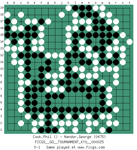 Last move : 0-1 2007 July 30 10:3:54 [Event "FICGS__GO__TOURNAMENT_KYU__000025"] [Site "FICGS"] [Date "2007.03.04"] [Round "1"] [Black "Cook,Phil"] [White "Nandor,George"] [Result "0-1"] [Rating 2 "0475"] 1.d4 c16 2.d14 e17 3.q16 r4 4.q4 q3 5.p4 p3 6.n4 k16 7.m16 q10 8.q9 r9 9.q8 r8 10.q11 r10 11.r12 c6 12.d7 c4 13.d5 c5 14.d10 d3 15.f4 f3 16.h4 h3 17.k4 f14 18.f12 p10 19.p12 q6 20.p6 q7 21.n6 p8 22.k10 n8 23.k7 k13 24.m12 m10 25.l12 n3 26.m4 m3 27.l3 l2 28.j3 j11 29.k12 j12 30.k11 j10 31.k9 j9 32.j8 m14 33.o16 o14 34.p14 o12 35.o13 n13 36.p13 n12 37.o15 g12 38.f10 g9 39.f9 g7 40.f7 f6 41.e7 c7 42.d6 c9 43.d9 c10 44.d11 c14 45.d13 c13 46.c12 b12 47.g3 h2 48.e3 f2 49.g8 h8 50.f8 j7 51.k8 r17 52.n14 r16 53.g10 h9 54.h6 h7 55.j6 e2 56.g6 q17 57.p17 r14 58.d16 d17 59.e16 f16 60.e15 f15 61.l14 m13 62.l13 k14 63.l15 k15 64.g11 h12 65.m15 p18 66.o18 q18 67.r15 q15 68.p16 s15 69.o7 l17 70.m18 l18 71.l19 k19 72.m19 j18 73.o8 o9 74.m8 m9 75.p11 o11 76.n7 n9 77.m11 c11 78.d12 e14 79.d15 m17 80.n18 s12 81.r11 s11 82.p7 e4 83.e5 f5 84.g4 n17 85.o17 n16 86.n15 q5 87.p5 k2 88.e3 c2 89.c15 b16 90.b15 b13 91.n11 o10 92.p9 p8 93.g2 j2 94.a16 b17 95.a17 a18 96.a15 k3 97.l4 c18 98.f1 e1 99.g1 r13 100.j4 q13 101.q14 f13 102.e12 a14 103.b14 b11 104.p15 l8 105.m7 d8 106.e8 c8 107.r15 r2 108.o3 o2 109.o4 o19 110.s14 s13 111.q15 t14 112.l9 l10 113.n19 p19 114.e4 a13 115.h1 j1 116.m2 n2 117.m1 n1 118.p2 l1 119.o1 p1 120.q1 q2 121.l7 q12 122.f17 g17 123.g5 l16 124.e6 e13 0-1 Here are the names of the openings (joseki) played in the four corners : Corner d16 : c16 d14 Komoku (Somok, Xiao~mu`) 3-4 Point. The komoku (3-4) point is the traditional corner enclosure move.. Corner q4 : r4 q4 Komoku (Somok, Xiao~mu`) 3-4 Point. The komoku (3-4) point is the traditional corner enclosure move.. Corner d4 : d4 c6 Hoshi (Hwajeom, Seongjeom, Xingwei`) 4-4 Point. The star or hoshi (4-4) point, emphasizing influence at the potential expense of territory. Ikken Kakari (Hankan Keolch'im, Yi Gua`jiao~, 1-Space Low Approach). White 2 is the standard approach move to the 4-4. Player White won this Go (weiqi, baduk) game. Follow this game move after move (download)There is death in the hane. (Anonymous) Any activity becomes creative when the doer cares about doing it right or doing it better. (John Updike)