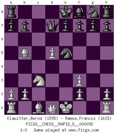 Last move : 1-0 2015 June 28 16:45:45 [Event "FICGS__CHESS__RAPID_D__000092"] [Site "FICGS"] [Date "2015.06.12"] [Round "1"] [White "Klawitter,Bernd"] [Black "Ramos,Francis"] [Result "1-0"] [WhiteElo "1595"] [BlackElo "1615"] 1.e4 c5 2.c3 d5 3.exd5 Qxd5 4.d4 cxd4 5.cxd4 Nc6 6.Nf3 Bg4 7.Nc3 Qd7 8.d5 Bxf3 9.gxf3 Ne5 10.Bb5 1-0 Sicilian : Alapin's variation (2.c3) Player White won this chess game. Follow this game move after move (download)There is no remorse like the remorse of Chess. (H. G. Wells) Ohne Leiden bildet sich kein Charakter. (Ernst Freiherr von Feuchtersleben) Aquel que toma al Peón de Caballo de la Reina, se pasará la noche a dormir en la calle. (Anónimo) Il vaut mieux sacrifier les pièces de l'adversaire. (Xavier Tartacover) The obstacle is the path. (Zen proverb)