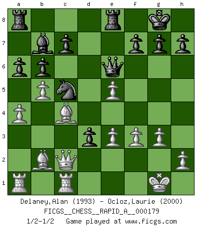 Last move : 1/2-1/2 2015 September 4 13:4:20 [Event "FICGS__CHESS__RAPID_A__000179"] [Site "FICGS"] [Date "2015.06.16"] [Round "1"] [White "Delaney,Alan"] [Black "Ocloz,Laurie"] [Result "1/2-1/2"] [WhiteElo "1993"] [BlackElo "2000"] 1.d4 Nf6 2.c4 e6 3.Nf3 b6 4.g3 Ba6 5.b3 Be7 6.Bg2 O-O 7.O-O d5 8.Ne5 Bb7 9.Bb2 Nbd7 10.Nc3 Ne4 11.Nd3 Nxc3 12.Bxc3 Rb8 13.cxd5 exd5 14.b4 Nf6 15.b5 Re8 16.Qb3 Bd6 17.e3 a6 18.a4 Qd7 19.Ne5 Qf5 20.Rfc1 Ne4 21.Qc2 Qe6 22.Bb2 Ra8 23.f3 Nc5 24.Bf1 Bxe5 25.dxe5 d4 26.Bc4 d3 1/2-1/2 Queen's Indian : Nimzovich variation (exaggerated Fianchetto) Kingside Castling by player Black (move 6) Kingside Castling by player White (move 7) This chess game ended in a draw. Follow this game move after move (download)The King is a fighting piece. Use it ! (Wilhelm Steinitz) Die größte Kunst beim Schach besteht darin dem Gegner nicht zu zeigen was er tun kann. (Garry Kasparov) Si tu oponente no puede hacer nada activo, entonces no apures la posición; En vez de eso, dejalo estar sentado ahí, sufriendo y rogandote por un empate. (Jeremy Silman) Dieu déplace le joueur, et celui-ci la pièce. Quel Dieu derrière Dieu commence donc la trame ? Arturo Perez-Reverte (prix de littérature policière 1993). Over-the-board chess is the favorite of mortals, correspondence chess is the favorite of the gods. (Eduard Dyckhoff)