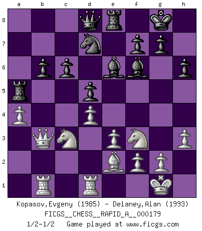 Last move : 1/2-1/2 2015 August 5 17:53:33 [Event "FICGS__CHESS__RAPID_A__000179"] [Site "FICGS"] [Date "2015.06.16"] [Round "1"] [White "Kopasov,Evgeny"] [Black "Delaney,Alan"] [Result "1/2-1/2"] [WhiteElo "1985"] [BlackElo "1993"] 1.d4 Nf6 2.c4 e6 3.Nc3 d5 4.Bg5 Be7 5.e3 O-O 6.Nf3 h6 7.Bh4 b6 8.Be2 Bb7 9.Bxf6 Bxf6 10.cxd5 exd5 11.b4 c6 12.O-O Re8 13.Qb3 a5 14.bxa5 Rxa5 15.a4 Bc8 16.Rfd1 Be6 17.Rab1 Nd7 18.h3 1/2-1/2 Queen's pawn game Kingside Castling by player Black (move 5) Kingside Castling by player White (move 12) This chess game ended in a draw. Follow this game move after move (download)The mistakes are there, waiting to be made. (Savielly Tartakower) Nicht daß Diemer aus Opportunismus Mitglied der NSDAP geworden wäre. Er war ein Fanatiker, in allem, was er tat. (Hans Ree) El Ajedrez es en su esencia, un juego. En su forma, un arte. Y en su ejecución, una ciencia. (Baron Tassilo) La tactique, c'est ce que vous faites quand il y a quelque chose à faire; la stratégie, c'est ce que vous faites quand il n'y a rien à faire. (Savielli Tartacower) Horse racing is animated roulette. (Roger Kahn)