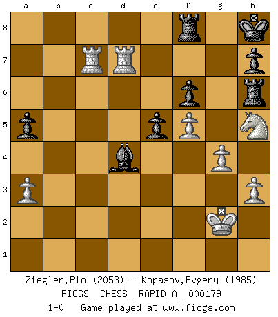 Last move : 1-0 2015 September 1 13:53:14 [Event "FICGS__CHESS__RAPID_A__000179"] [Site "FICGS"] [Date "2015.06.16"] [Round "1"] [White "Ziegler,Pio"] [Black "Kopasov,Evgeny"] [Result "1-0"] [WhiteElo "2053"] [BlackElo "1985"] 1.d4 Nf6 2.c4 e6 3.Nf3 b6 4.g3 Ba6 5.Nbd2 c5 6.e4 cxd4 7.e5 Ng4 8.h3 Nh6 9.Bg2 Nc6 10.O-O Nf5 11.a3 Be7 12.b4 Bb7 13.g4 Nh4 14.Nxh4 Bxh4 15.Ne4 Be7 16.Bg5 f6 17.exf6 gxf6 18.Bh6 Rg8 19.Bf4 d6 20.Rc1 Rc8 21.Qe2 Kf8 22.Rce1 Kg7 23.Ng3 e5 24.Nh5+ Kh8 25.Bg3 Qc7 26.f4 Rcf8 27.Bd5 Rg6 28.Qf2 d3 29.Qg2 Rb8 30.Re3 Nd4 31.Rxd3 Bxd5 32.Qxd5 Ne2+ 33.Kh2 Nxg3 34.Rxg3 Rc8 35.f5 Rh6 36.Rc3 Rg8 37.Rg1 Rc8 38.Rd1 Rg8 39.Qe6 Qb7 40.Rg3 Qc7 41.Rd2 Rf8 42.R2d3 a6 43.c5 bxc5 44.bxc5 d5 45.Rxd5 Bxc5 46.Rd7 Qb6 47.Qxb6 Bxb6 48.Rc3 a5 49.Kg2 Bd4 50.R3c7 1-0 Queen's Indian : Nimzovich variation (exaggerated Fianchetto) Kingside Castling by player White (move 10) Player White won this chess game. Follow this game move after move (download)You must take your opponent into a deep dark forest where 2+2=5, and the path leading out is only wide enough for one. (Mikhail Tal) Wer nie einen Fehler gemacht hat, hat nie etwas Neues ausprobiert. (Albert Einstein) El Ajedrez, como cualquier otra actividad creativa, puede existir solo a través de méritos combinados de aquellos que tienen talento creativo y de aquellos que tienen la habilidad de organizar un trabajo creativo. (Mikhail Botvinnik) Les échecs sont un jeu par leur forme, un art par leur essence et une science par sa difficulté d'acquisition. Ils peuvent vous procurer autant de plaisir qu'un bon livre ou une belle musique, mais vous n'aurez une réelle joie que si vous arrivez à bien jouer. (Tigran Petrosian) The only thing that matters is the evidence. (Horatio Caine, C.S.I. Miami)