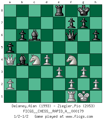Last move : 1/2-1/2 2015 August 5 17:53:52 [Event "FICGS__CHESS__RAPID_A__000179"] [Site "FICGS"] [Date "2015.06.16"] [Round "1"] [White "Delaney,Alan"] [Black "Ziegler,Pio"] [Result "1/2-1/2"] [WhiteElo "1993"] [BlackElo "2053"] 1.d4 Nf6 2.c4 e6 3.Nf3 b6 4.g3 Ba6 5.b3 Bb4+ 6.Bd2 Be7 7.Bg2 d5 8.cxd5 exd5 9.O-O O-O 10.Nc3 Re8 11.Ne5 Bb7 12.Rc1 Nbd7 13.Bf4 Nf8 14.Bh3 c5 15.Nd3 c4 16.Ne5 Ba3 17.Rc2 Bd6 18.e3 Bb4 19.Bg5 Ne6 20.Bh4 Rc8 21.Ne2 a5 22.Bf5 Rc7 23.Bxe6 Rxe6 24.Nf4 Re8 25.bxc4 dxc4 26.Rxc4 Rxc4 27.Nxc4 h6 28.Bxf6 Qxf6 29.Qa4 Bc6 1/2-1/2 Queen's Indian : Nimzovich variation (exaggerated Fianchetto) Kingside Castling by player White (move 9) Kingside Castling by player Black (move 9) This chess game ended in a draw. Follow this game move after move (download)I play correspondence chess because it is both art and science while chess is art only. (A player at FICGS) Um dein Spiel zu verbessern musst du zuallererst das Endspiel studieren, denn diese kann unabhängig studiert werden. Die Eröffnung und das Mittelspiel müssen immer in Bezug gesetzt werden zum Endspiel. (José Raúl Capablanca) Ciertamente el estado mental actual de Bobby Fischer es una tragedia. Uno de los mas grandes jugadores de Ajedrez del mundo -el orgullo y pena del Ajedrez Americano. (Frank Brady) Si rien de grave n'est détecté lors de l'analyse d'une position, on joue alors le coup. Seconde règle de Blumenfeld. Unless I accept my faults I will most certainly doubt my virtues. (Hugh Prather)