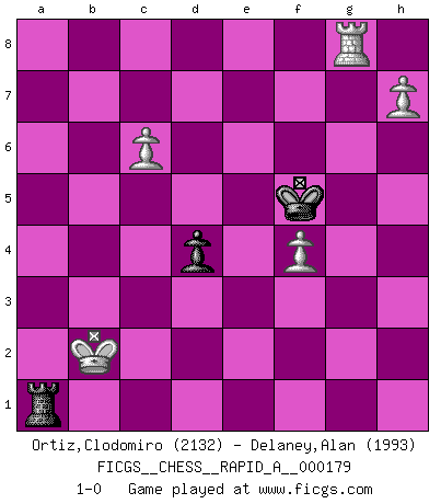 Last move : 1-0 2015 November 2 20:33:23 [Event "FICGS__CHESS__RAPID_A__000179"] [Site "FICGS"] [Date "2015.06.16"] [Round "1"] [White "Ortiz,Clodomiro"] [Black "Delaney,Alan"] [Result "1-0"] [WhiteElo "2132"] [BlackElo "1993"] 1.d4 Nf6 2.c4 e6 3.Nc3 d5 4.Bg5 Be7 5.e3 O-O 6.cxd5 exd5 7.Bd3 h6 8.Bh4 c6 9.Qc2 Ne8 10.Bg3 Bd6 11.Nge2 Bxg3 12.Nxg3 Be6 13.O-O Nd7 14.Na4 Nd6 15.Nc5 Re8 16.a4 a5 17.Rfb1 Qe7 18.Qc3 Red8 19.b4 axb4 20.Rxb4 Nxc5 21.dxc5 Nc4 22.Nh5 f6 23.Rab1 Rd7 24.h4 Rc7 25.Nf4 Bf7 26.h5 Qe5 27.Qxe5 Nxe5 28.Bf5 Ra7 29.g4 Nf3+ 30.Kg2 Nh4+ 31.Kg3 Nxf5+ 32.gxf5 Kf8 33.Kg4 Ke7 34.a5 Ke8 35.Kf3 Kd8 36.Rg1 Bg8 37.Ra1 Bf7 38.R4b1 Ke8 39.a6 Rxa6 40.Rxb7 Rxb7 41.Rxa6 Kd7 42.Kg3 Rc7 43.Ra8 Rb7 44.Ng6 Be8 45.Kg2 d4 46.exd4 Bf7 47.f3 Bd5 48.Nf4 Bf7 49.Kg3 Bc4 50.Ra1 Bf7 51.Kf2 Bc4 52.Ke3 Rb3+ 53.Ke4 Rb7 54.Rg1 Ke8 55.Ne6 Rb3 56.Kf4 Bd5 57.Nc7+ Kf7 58.Nxd5 cxd5 59.Rc1 Ke7 60.Re1+ Kf7 61.Re3 Rb4 62.Rd3 Ke7 63.Ke3 Rb8 64.Ra3 Rb7 65.Kd2 Kd8 66.Ra8+ Kc7 67.Kc3 Kc6 68.Ra6+ Kc7 69.Re6 Rb1 70.Re7+ Kc6 71.Rxg7 Rf1 72.Rg3 Kb5 73.Kd2 Ra1 74.Rg6 Kc4 75.c6 Ra7 76.Rxf6 Kxd4 77.Rxh6 Ke5 78.f6 Ra2+ 79.Kc3 d4+ 80.Kc4 Ra7 81.Rg6 Rf7 82.h6 Rc7 83.Kd3 Ra7 84.f4+ Kf5 85.f7 Rxf7 86.Rg7 Rf8 87.h7 Ra8 88.Rg8 Ra3+ 89.Kd2 Ra2+ 90.Kc1 Ra1+ 91.Kb2 1-0 Queen's pawn game Kingside Castling by player Black (move 5) Kingside Castling by player White (move 13) 10 pieces endgame at move 76 : White KRPPPP , Black KRPP WHITE : King + 1 Rook 4 Pawns BLACK : King + 1 Rook 2 Pawns 9 pieces endgame at move 77 : White KRPPPP , Black KRP WHITE : King + 1 Rook 4 Pawns BLACK : King + 1 Rook 1 Pawn 8 pieces endgame at move 85 : White KRPPP , Black KRP WHITE : King + 1 Rook 3 Pawns BLACK : King + 1 Rook 1 Pawn Player White won this chess game. Follow this game move after move (download)There are two types of sacrifices: correct ones and mine. (Mikhail Tal) Gewöhnliche Menschen denken nur daran, wie sie ihre Zeit verbringen. Ein intelligenter Mensch versucht, sie auszunutzen. (Arthur Schopenhauer) ¿Se han dado cuenta de que Fischer casi nunca ha tenido piezas malas? El las intercambia y las piezas malas se quedan con sus oponenets. (Yuri Balashov) La vérité est comme le meilleur coup aux échecs : elle existe, mais il faut la chercher. (Arturo Perez-Reverte) When you stop learning you start dying. (Scott Adams)
