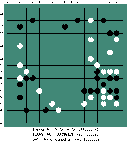 Last move : 1-0 2007 May 6 7:59:35 [Event "FICGS__GO__TOURNAMENT_KYU__000025"] [Site "FICGS"] [Date "2007.03.04"] [Round "1"] [Black "Nandor,George"] [White "Perrotta,John Zach"] [Result "1-0"] [Rating 1 "0475"] 1.q17 j3 2.c16 q4 3.d3 r9 4.r15 c10 5.c5 c13 6.e17 r12 7.k16 n4 8.d8 c8 9.c7 d9 10.e8 f6 11.g3 h4 12.r6 r5 13.p6 o17 14.m17 o14 15.s5 s4 16.s6 s14 17.s15 o11 18.s8 s9 19.n6 o5 20.o6 q6 21.q7 q5 22.p9 p10 23.r8 q9 24.p8 1-0 This go game has been lost on time (started : 2007.03.04 15:36:14) Here are the names of the openings (joseki) played in the four corners : Corner d4 : j3 d3 This joseki is unknown. A weak or weird move has probably been played in this corner. Corner d16 : c16 c13 Komoku (Somok, Xiao~mu`) 3-4 Point. The komoku (3-4) point is the traditional corner enclosure move.. Player Black won this Go (weiqi, baduk) game. Follow this game move after move (download)There are players who don't accept exchange: they play many moves that perpetuate a previous state of the game. (Pierre Audouard) Faith : not wanting to know what is true. (Friedrich Nietzsche)