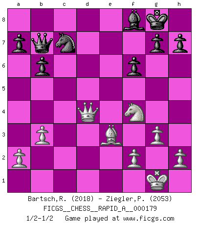 Last move : 1/2-1/2 2015 July 2 20:49:48 [Event "FICGS__CHESS__RAPID_A__000179"] [Site "FICGS"] [Date "2015.06.16"] [Round "1"] [White "Bartsch,Reinhard Andrea"] [Black "Ziegler,Pio"] [Result "1/2-1/2"] [WhiteElo "2018"] [BlackElo "2053"] 1.d4 Nf6 2.c4 e6 3.Nf3 b6 4.g3 Ba6 5.b3 Bb4+ 6.Bd2 Be7 7.Bg2 d5 8.cxd5 exd5 9.Nc3 O-O 10.O-O Re8 11.Re1 Bb7 12.Qc2 Na6 13.Bf4 Ne4 14.Red1 Nxc3 15.Qxc3 f6 16.Ne1 c6 17.Nd3 Bf8 18.Re1 Qe7 19.e4 dxe4 20.Rxe4 Qd7 21.Rxe8 Rxe8 22.Qc4+ Kh8 23.Rc1 c5 24.Bxb7 Qxb7 25.Be3 Re4 26.Qc3 cxd4 27.Bxd4 Re7 28.Be3 Rc7 29.Qd4 Kg8 30.Rxc7 Nxc7 31.Nf4 1/2-1/2 Queen's Indian : Nimzovich variation (exaggerated Fianchetto) Kingside Castling by player Black (move 9) Kingside Castling by player White (move 10) This chess game ended in a draw. Follow this game move after move (download)The hardest game to win is a won game. (Emanuel Lasker) In Buenos Aires ist es nicht mein vorrangiges Ziel ein starkes Turnier zu organisieren, sondern ein Turnier für Gentlemen. Ich würde nie Kamsky einladen. Ich mag keine Probleme. (Miguel Najdorf) Las piezas de Ajedrez son los bloques del alfabeto que moldean los pensamientos; y esos pensamientos, aunque hagan un diseño visual en el tablero, expresan abstractamente su belleza como un poema. (Marcel Duchamp) Aux échecs, l'amour-propre est satisfait quand on remporte la victoire, mais il n'y a pas de honte à être battu. (Benjamin Franklin) Animated gif is worth one mega-word. (Unknown)