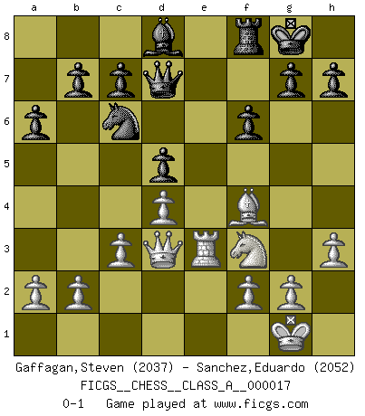 Last move : 0-1 2007 July 2 15:34:36 [Event "FICGS__CHESS__CLASS_A__000017"] [Site "FICGS"] [Date "2007.03.05"] [Round "1"] [White "Gaffagan,Steven"] [Black "Sanchez,Eduardo"] [Result "0-1"] [WhiteElo "2037"] [BlackElo "2052"] 1.e4 e5 2.Nf3 Nf6 3.Nxe5 d6 4.Nf3 Nxe4 5.d4 d5 6.Bd3 Nc6 7.O-O Bf5 8.Re1 Be7 9.Nbd2 Nxd2 10.Qxd2 Bxd3 11.Qxd3 Qd7 12.c3 a6 13.Bf4 O-O 14.Re3 Rae8 15.Rae1 Bd8 16.h3 Rxe3 17.Rxe3 f6 0-1 This chess game has been lost on time (started : 2007.03.05 3:0:44) Petrov : Classical attack Kingside Castling by player White (move 7) Kingside Castling by player Black (move 13) Player Black won this chess game. Follow this game move after move (download)All Chess players should have a hobby. (Savielly Tartakower) Wenn ich gewinne bin ich ein Genie. Wenn nicht, dann bin ich keines. (Robert James Fischer) Hoy en día, si tu no eres un Gran Maestro a los 14 años, es mejor que lo olvides. (Anand Viswanathan) Le thème de l'attaque double intervient d'une manière ou d'une autre dans l'immense majorité des combinaisons. (Youri Averbakh) A cynic is a man who knows the price of everything but the value of nothing. (Oscar Wilde)