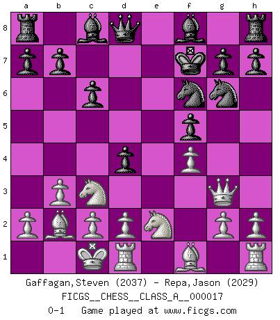 Last move : 0-1 2007 June 14 19:32:12 [Event "FICGS__CHESS__CLASS_A__000017"] [Site "FICGS"] [Date "2007.03.05"] [Round "1"] [White "Gaffagan,Steven"] [Black "Repa,Jason"] [Result "0-1"] [WhiteElo "2037"] [BlackElo "2029"] 1.b3 e6 2.Bb2 f5 3.e4 Nf6 4.exf5 exf5 5.Qe2+ Kf7 6.Qf3 d5 7.Nc3 Nc6 8.O-O-O Ne5 9.Qg3 Ng6 10.Nge2 c6 11.f4 d4 0-1 This chess game has been lost on time (started : 2007.03.05 3:0:44) Nimzovich-Larsen attack Queenside Castling by player White (move 8) Player Black won this chess game. Follow this game move after move (download)It was clear to me that the vulnerable point of the American Grandmaster (Bobby Fischer) was in double-edged, hanging, irrational positions, where he often failed to find a win even in a won position. (Efim Geller) Es macht mich traurig, wenn ich sehe, dass Golfprofis mehr verdienen als Schachsportler. Obwohl ich davon überzeugt bin, dass wir Schachspieler viel härter trainieren müssen als die Golfer. (Alexandra Kosteniuk) Ser exitoso en el Ajedrez te permite descubrir tu propia personalidad. Eso es lo que deseo para los niños de mi clase. (Saudin Robovic) Les échecs c'est le défi de l'alpiniste, toujours plus haut, prêt à tout pour monter à l'assaut du Roi ennemi. Les échecs, c'est de la musique en mouvement, un ballet majestueux pour les yeux. C'est de la poésie composée par les fantômes du passé qui au même titre que Rimbaud ou Verlaine méritent notre admiration. Les échecs, c'est de la peinture ou le moindre mouvement modifie le tableau pour en faire un Picasso ou un Van Gogh. Les échecs, c'est tout et rien, c'est la vie et la mort. Jjulie33 sur le forum de France-Echecs. Don't be irreplaceable, if you can't be replaced, you can't be promoted. (Dan Rotaru)