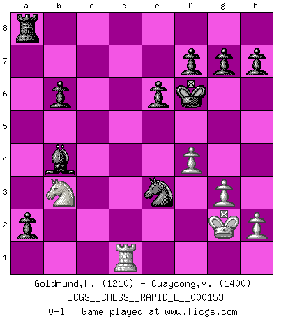 Last move : 0-1 2015 August 20 10:10:48 [Event "FICGS__CHESS__RAPID_E__000153"] [Site "FICGS"] [Date "2015.06.18"] [Round "1"] [White "Goldmund,Heike"] [Black "Cuaycong,Virgilio"] [Result "0-1"] [WhiteElo "1210"] [BlackElo "1400"] 1.e4 c5 2.b4 cxb4 3.a3 d5 4.e5 Nc6 5.d4 Qb6 6.Nf3 Bg4 7.axb4 Bxf3 8.Qxf3 Qxd4 9.Qc3 Qxe5+ 10.Qxe5 Nxe5 11.Bb5+ Nc6 12.O-O e6 13.Bb2 Nf6 14.Ba3 Bd6 15.Nd2 Ke7 16.c4 Nxb4 17.Rfb1 a5 18.Nb3 dxc4 19.Bxc4 Rhc8 20.Nd2 b6 21.Bb2 Bf4 22.Nf3 Rxc4 23.Bxf6+ Kxf6 24.g3 Bd6 25.Nd2 Rd4 26.Rd1 Nd5 27.Kg2 Bb4 28.Nb3 Rxd1 29.Rxd1 a4 30.Nd4 a3 31.Nb3 a2 32.f4 Ne3+ 0-1 Sicilian : wing gambit, Marshall variation Kingside Castling by player White (move 12) Player Black won this chess game. Follow this game move after move (download)Methodical thinking is of more use in Chess than inspiration. (C. J. S. Purdy) Die westlichen Werte sind eine Sprache, welche die Putin-Administration nicht versteht. (Garry Kasparov) Con el fin de mejorar tu juego, debes de estudiar los finales antes que todo, ya que mientras que los finales pueden ser estudiados y dominados por sí mismos, el juegomedio y la apertura deben de ser estudiados en relación con los finales. (José Raúl Capablanca) Vouloir jouer aux échecs contre soi-même est aussi paradoxal que vouloir marcher sur son ombre. (Stefan Zweig) I would love to change the world, but they won't give me the source code. (Unknown)