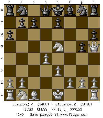 Last move : 1-0 2015 June 28 6:48:9 [Event "FICGS__CHESS__RAPID_E__000153"] [Site "FICGS"] [Date "2015.06.18"] [Round "1"] [White "Cuaycong,Virgilio"] [Black "Stoyanov,Zdravko"] [Result "1-0"] [WhiteElo "1400"] [BlackElo "1016"] 1.d4 d5 2.c4 dxc4 3.Nf3 h6 4.e3 Bg4 5.Bxc4 a6 6.Bxf7+ Kxf7 7.Ne5+ Ke8 8.Qxg4 g5 9.Qh5+ 1-0 QGA : 3.Nf3 Player White won this chess game. Follow this game move after move (download)A man without frontiers. He didn't divide the East and the West, he brought them together in their admiration for him. (Ljubomir Ljubojevic, about Bobby Fischer's death) Privat ist Kortschnoi kein schlechter Mensch, sehr sympathisch. Aber während des Spiels ist er grausam. Er will dich töten. (Miguel Najdorf) El tablero es el mundo, las piezas es el fenomeno del universo, las reglas del juego son lo que llamamos leyes de la naturaleza y el jugador del lado opuesto, se encuentra oculto a nuestra vista. (Thomas Huxley) Les échecs, c'est l'art d'analyser. (Mikhail Botvinnik) Winning isn't everything... but losing is nothing. (Mednis)