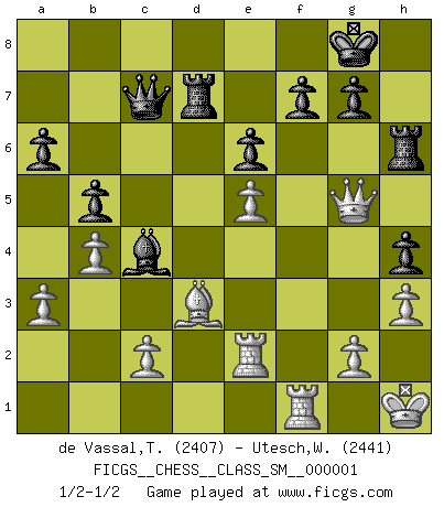 Last move : 1/2-1/2 2006 July 8 12:48:44 [Event "FICGS__CHESS__CLASS_SM__000001"] [Site "FICGS"] [Date "2006.05.30"] [Round "1"] [White "de Vassal,Thibault"] [Black "Utesch,Wolfgang"] [Result "1/2-1/2"] [WhiteElo "2407"] [BlackElo "2441"] 1.e4 c5 2.Nf3 d6 3.d4 cxd4 4.Nxd4 Nf6 5.Nc3 a6 6.Be3 e6 7.Bd3 b5 8.O-O Bb7 9.f4 Nbd7 10.Qf3 Rc8 11.a3 Be7 12.Qg3 h5 13.Nf3 h4 14.Qh3 Nc5 15.e5 dxe5 16.fxe5 Nd5 17.Nxd5 Qxd5 18.Bxc5 Qxc5+ 19.Kh1 Rh6 20.Rae1 Rd8 21.Re2 Kf8 22.b4 Qc7 23.Ng1 Rd7 24.Qg4 Bd8 25.h3 Bd5 26.Nf3 Kg8 27.Ng5 Bxg5 28.Qxg5 Bc4 1/2-1/2 Sicilian : Najdorf, Byrne (English) attack Kingside Castling by player White (move 8) This chess game ended in a draw. Follow this game move after move (download)What would Chess be without silly mistakes ? (Kurt Richter) Es hat in meinem Leben Zeiten gegeben, da ich sehr nahe daran war zu glauben, daß ich auch nicht eine einzige Schachpartie verlieren könnte. (José Raúl Capablanca) Mis oponentes también hacen buenas movidas. A veces yo no tomo esas cosas en consideración. (Bobby Fischer) Vous n'êtes pas toujours obligé de jouer le meilleur coup. Un coup doit être actif, entreprenant, correct et beau ! (David Bronstein) Now the reason the enlightened prince and the wise general conquer the enemy whenever they move and their achievements surpass those of ordinary men is foreknowledge. (Sun Tzu)