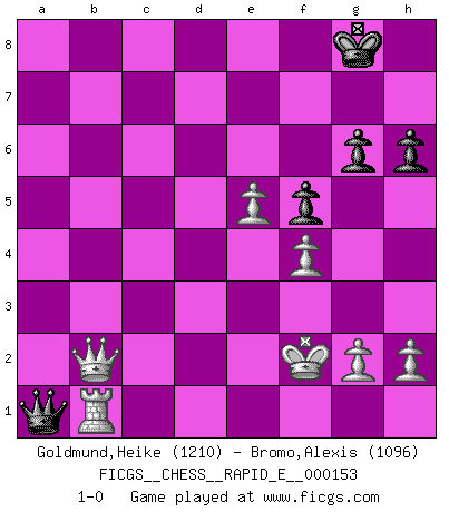 Last move : 1-0 2015 July 2 22:52:55 [Event "FICGS__CHESS__RAPID_E__000153"] [Site "FICGS"] [Date "2015.06.18"] [Round "1"] [White "Goldmund,Heike"] [Black "Bromo,Alexis"] [Result "1-0"] [WhiteElo "1210"] [BlackElo "1096"] 1.b4 e5 2.Bb2 d6 3.c4 Nf6 4.e3 Be7 5.Nf3 a6 6.Be2 Bg4 7.d3 Bxf3 8.Bxf3 c6 9.O-O Nbd7 10.Nc3 O-O 11.Ne4 h6 12.Nxf6+ Bxf6 13.e4 b5 14.cxb5 axb5 15.Qc2 c5 16.bxc5 dxc5 17.Rfd1 Re8 18.Bg4 Rc8 19.Qe2 Be7 20.Qf3 Rc7 21.Bh5 Nf6 22.Bxe5 Rb7 23.Rab1 Nxh5 24.Qxh5 Bg5 25.Bg3 Qa8 26.Qe2 b4 27.f4 Bd8 28.e5 Bb6 29.Bf2 f5 30.d4 cxd4 31.Bxd4 Bxd4+ 32.Rxd4 Qa7 33.Qc4+ Kh7 34.Kf2 Rd8 35.Rbd1 Rxd4 36.Qxd4 Qxa2+ 37.Kf1 b3 38.Qd3 g6 39.Qd5 Qa6+ 40.Kf2 b2 41.Rb1 Qa1 42.Qxb7+ Kg8 43.Qxb2 1-0 Polish (Sokolsky) opening Kingside Castling by player White (move 9) Kingside Castling by player Black (move 10) Player White won this chess game. Follow this game move after move (download)By the beauty of his games, the clarity of his play, and the brilliance of his ideas, Fischer made himself an artist of the same stature as Brahms, Rembrandt, and Shakespeare. (David Levy) Ein Remis kann durch Wiederholung von drei Zügen oder durch einen schlechte Zug erreicht werden. (Savielly Grigorievitsch Tartakower) Yo creo que el Ajedrez posee una magia que es también una ayuda en la edad avanzada. Una rodilla reumática es olvidada durante una partida de Ajedrez y otros eventos pueden parecer algo sin importancia comparada a una catástrofe en el tablero de Ajedrez. (Vlastimil Hort) Le joueur d'Echecs qui veut atteindre le top est obligé de développer son propre credo créatif. Alexeï Stepanovicth Souétine. Il est facile d'écrire des livres ! Ce qui est difficile, c'est de jouer ! (Alexeï Stepanovicth Souétine) Knowledge will give you power, but character respect. (Bruce Lee)