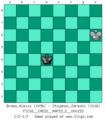 Last move : 1/2-1/2 2015 July 3 10:17:58 [Event "FICGS__CHESS__RAPID_E__000153"] [Site "FICGS"] [Date "2015.06.18"] [Round "1"] [White "Bromo,Alexis"] [Black "Stoyanov,Zdravko"] [Result "1/2-1/2"] [WhiteElo "1096"] [BlackElo "1016"] 1.d4 d5 2.c4 dxc4 3.Nc3 h6 4.e4 e6 5.a3 a6 6.Bxc4 b5 7.Ba2 Ne7 8.Nf3 Bb7 9.O-O Ng6 10.Re1 Be7 11.b4 O-O 12.h3 Nd7 13.Be3 Nb6 14.d5 exd5 15.Nxd5 Nxd5 16.exd5 Bf6 17.Rc1 Bb2 18.Rc2 Bxa3 19.Qd4 Qd6 20.Rc5 Ne7 21.Bf4 Nf5 22.Qe4 Qf6 23.Rxc7 Bc8 24.d6 Nxd6 25.Qxa8 Qxf4 26.Rxc8 Rxc8 27.Qxa6 Bxb4 28.Ne5 Rf8 29.Ng6 Qd2 30.Nxf8 Qxe1+ 31.Kh2 Kxf8 32.Qa8+ Ne8 33.Qf3 Bd6+ 34.g3 Nf6 35.Qa8+ Qe8 36.Qb7 Bxg3+ 37.fxg3 Qe2+ 38.Qg2 Qxg2+ 39.Kxg2 Ke7 40.Kf3 Kd6 41.Bxf7 Kc5 42.Ke3 Kb4 43.Kf4 Kc3 44.Kf5 b4 45.Kg6 b3 46.Bxb3 Kxb3 47.Kxg7 Ne4 48.Kxh6 Nxg3 49.Kg5 Ne4+ 50.Kf4 Nf6 51.h4 Kc4 52.Kf5 Nh5 53.Kg5 Ng7 54.h5 Nxh5 55.Kxh5 Kd4 56.Kh6 1/2-1/2 Queen's gambit accepted Kingside Castling by player White (move 9) Kingside Castling by player Black (move 11) 10 pieces endgame at move 39 : White KBPP , Black KNPPPP WHITE : King + 1 Bishop 2 Pawns BLACK : King + 1 Knight 4 Pawns 9 pieces endgame at move 41 : White KBPP , Black KNPPP WHITE : King + 1 Bishop 2 Pawns BLACK : King + 1 Knight 3 Pawns 8 pieces endgame at move 46 : White KBPP , Black KNPP WHITE : King + 1 Bishop 2 Pawns BLACK : King + 1 Knight 2 Pawns 7 pieces endgame at move 46 : White KPP , Black KNPP WHITE : King + 2 Pawns BLACK : King + 1 Knight 2 Pawns 6 pieces endgame at move 47 : White KPP , Black KNP WHITE : King + 2 Pawns BLACK : King + 1 Knight 1 Pawn 5 pieces endgame at move 48 : White KPP , Black KN WHITE : King + 2 Pawns BLACK : King + 1 Knight 4 pieces endgame at move 48 : White KP , Black KN WHITE : King + 1 Pawn BLACK : King + 1 Knight 3 pieces endgame at move 54 : White K , Black KN WHITE : King + BLACK : King + 1 Knight 2 pieces endgame at move 55 : White K , Black K WHITE : King + BLACK : King + This chess game ended in a draw. Follow this game move after move (download)The only thing Chess players have in common is Chess. (Lodewijk Prins) Frage: Wie viele Autos haben Sie schon zerstört? - Antwort: Nur zwei. (Loek van Wely) Personalmente, yo prefiero mirar hacia el futuro en donde un programa de computadora gane el título mundial de Ajedrez. La humanidad necesita una lección de humildad. (Richard Dawkings) Mais n'est-ce pas déjà le limiter injurieusement que d'appeler les échecs un jeu? N'est-ce pas aussi une science, un art, ou quelque chose qui, comme le cercueil de Mahomet entre ciel et terre, est suspendu entre l'un et l'autre, et qui réunit un nombre incroyable de contraires ? (Stefan Zweig) To err is human, to shift the blame on someone else is tactical. (Mladen Jankovic)