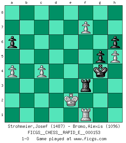 Last move : 1-0 2015 September 11 6:13:46 [Event "FICGS__CHESS__RAPID_E__000153"] [Site "FICGS"] [Date "2015.06.18"] [Round "1"] [White "Strohmeier,Josef"] [Black "Bromo,Alexis"] [Result "1-0"] [WhiteElo "1487"] [BlackElo "1096"] 1.e4 e5 2.Nf3 Nc6 3.Bb5 d6 4.d4 Bd7 5.Nc3 h6 6.dxe5 dxe5 7.Bxc6 Bxc6 8.Qxd8+ Rxd8 9.Nxe5 Ne7 10.O-O Ng6 11.Nxc6 bxc6 12.Be3 a6 13.a3 Bd6 14.g3 O-O 15.Rad1 Ne5 16.Kg2 Nc4 17.Bc1 f5 18.exf5 Rxf5 19.Ne4 Rdf8 20.Nxd6 cxd6 21.b3 Ne5 22.Rxd6 Ng4 23.f3 Ne5 24.f4 Ng4 25.Rxc6 R8f6 26.Rxf6 Rxf6 27.c4 Re6 28.h3 Ne3+ 29.Bxe3 Rxe3 30.Rb1 Re2+ 31.Kf3 Rh2 32.h4 Kf7 33.a4 Rc2 34.h5 Kf6 35.g4 g5 36.f5 Rc3+ 37.Kf2 Ke5 38.Re1+ Kf4 39.f6 Rxb3 40.f7 Rf3+ 41.Kg2 Kxg4 42.Rf1 Rg3+ 43.Kf2 Rf3+ 44.Ke2 1-0 Ruy Lopez : Old Steinitz defense Kingside Castling by player White (move 10) Kingside Castling by player Black (move 14) Player White won this chess game. Follow this game move after move (download)A man that will take back a move at Chess will pick a pocket. (Richard Fenton) Computer sind die einzigen Gegner, die nicht immer eine Ausrede auf Lager haben, wenn sie gegen mich verlieren. (Robert James Fischer) La última cosa en que Fischer estaba interesado era en tonterías, siempre y cuando el Ajedrez estuviera involucrado. (Elie Agur) Même si vous avez un bon coup à faire, regardez toujours s'il n'y en a pas un qui lui soit préférable. (Pedro Damiano) Inventor: A person who makes an ingenious arrangement of wheels, levers and springs, and believes it civilization. (Ambrose Bierce, The Devil's Dictionary)