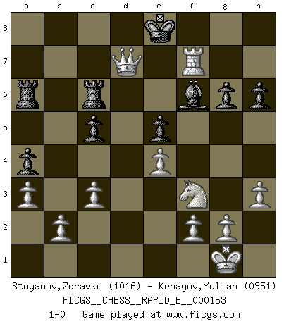 Last move : 1-0 2015 August 26 17:14:7 [Event "FICGS__CHESS__RAPID_E__000153"] [Site "FICGS"] [Date "2015.06.18"] [Round "1"] [White "Stoyanov,Zdravko"] [Black "Kehayov,Yulian"] [Result "1-0"] [WhiteElo "1016"] [BlackElo "0951"] 1.e4 g6 2.Nf3 Bg7 3.d4 d6 4.h3 Nf6 5.Bd3 O-O 6.O-O c6 7.a3 b5 8.Re1 Re8 9.Nbd2 a5 10.c3 e5 11.dxe5 dxe5 12.Nb3 a4 13.Nc5 Na6 14.Nxa6 Rxa6 15.Bg5 Qd6 16.Qe2 h6 17.Bxf6 Bxf6 18.Rab1 Rd8 19.Rbd1 c5 20.Bxb5 Rb6 21.Rxd6 R8xd6 22.Nd2 Ba6 23.Bxa6 Rxa6 24.Qc4 Rdc6 25.Re3 Kg7 26.Nf3 Kf8 27.Qb5 Kg7 28.Rd3 Kh7 29.Rd7 Kg7 30.Qb7 Kf8 31.Rxf7+ Ke8 32.Qd7+ 1-0 Robatsch (Modern) defense Kingside Castling by player Black (move 5) Kingside Castling by player White (move 6) Player White won this chess game. Follow this game move after move (download)Fischer is under obligation to nobody. (Joseph Platz) Je älter ich werde, um so mehr schätze ich die Bauern. (Paul Keres) El poder defensivo de una pieza clavada, solamente es imaginario. (Aaron Nimzovich) Les ravages du H expliquent la différence de niveau entre Tal et Thal [Abergel]. Art is not a thing, it is a way. (Elbert Hubbard)