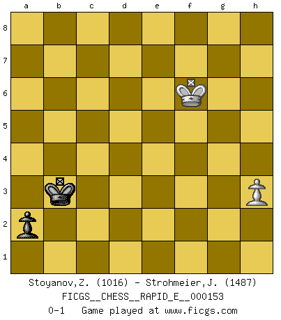 Last move : 0-1 2015 October 23 18:51:30 [Event "FICGS__CHESS__RAPID_E__000153"] [Site "FICGS"] [Date "2015.06.18"] [Round "1"] [White "Stoyanov,Zdravko"] [Black "Strohmeier,Josef"] [Result "0-1"] [WhiteElo "1016"] [BlackElo "1487"] 1.e4 c5 2.Nf3 d6 3.h3 Nf6 4.c3 Nxe4 5.Qa4+ Bd7 6.Qxe4 Bc6 7.Qd3 g6 8.Be2 Bg7 9.O-O O-O 10.Na3 Nd7 11.Re1 a6 12.Qc4 b5 13.Qf4 e5 14.Qe3 Re8 15.Nh2 d5 16.d3 d4 17.cxd4 exd4 18.Qg5 Qxg5 19.Bxg5 Nf6 20.Ng4 Nxg4 21.Bxg4 h5 22.Be2 Re6 23.Nc2 Rae8 24.Bd2 Rxe2 25.Rxe2 Rxe2 26.Rd1 Bf6 27.Kf1 Re8 28.Re1 Rxe1+ 29.Nxe1 Be5 30.f4 Bd6 31.g3 Bd5 32.b3 c4 33.bxc4 bxc4 34.dxc4 Bxc4+ 35.Kf2 Bxa2 36.Nd3 Bc4 37.Nb2 Bb5 38.Ke1 Kf8 39.Kf2 Bc5 40.Kf3 Ke7 41.Ke4 Ke6 42.Ba5 f5+ 43.Kf3 Kd5 44.g4 d3 45.gxf5 gxf5 46.Kg3 Ke4 47.Kh4 Be8 48.Bd2 Bd4 49.Nc4 Bf7 50.Nd6+ Kf3 51.Nxf7 Ke2 52.Ba5 d2 53.Bxd2 Kxd2 54.Kxh5 a5 55.Nd6 a4 56.Kg5 Kc3 57.Nb5+ Kc4 58.Na3+ Kb3 59.Nb5 Bb2 60.Kxf5 Kb4 61.Na3 Kxa3 62.Kg6 Kb3 63.f5 a3 64.f6 Bxf6 65.Kxf6 a2 0-1 Sicilian Kingside Castling by player White (move 9) Kingside Castling by player Black (move 9) 10 pieces endgame at move 53 : White KBNPP , Black KBPPP WHITE : King + 1 Bishop 1 Knight 2 Pawns BLACK : King + 1 Bishop 3 Pawns 9 pieces endgame at move 53 : White KNPP , Black KBPPP WHITE : King + 1 Knight 2 Pawns BLACK : King + 1 Bishop 3 Pawns 8 pieces endgame at move 54 : White KNPP , Black KBPP WHITE : King + 1 Knight 2 Pawns BLACK : King + 1 Bishop 2 Pawns 7 pieces endgame at move 60 : White KNPP , Black KBP WHITE : King + 1 Knight 2 Pawns BLACK : King + 1 Bishop 1 Pawn 6 pieces endgame at move 61 : White KPP , Black KBP WHITE : King + 2 Pawns BLACK : King + 1 Bishop 1 Pawn 5 pieces endgame at move 64 : White KP , Black KBP WHITE : King + 1 Pawn BLACK : King + 1 Bishop 1 Pawn 4 pieces endgame at move 65 : White KP , Black KP WHITE : King + 1 Pawn BLACK : King + 1 Pawn Player Black won this chess game. Follow this game move after move (download)Nowadays, when you're not a grandmaster at 14, you can forget about it. (Anand Viswanathan) Es war undenkbar für die Behörden, dass ein sowjetischer Großmeister auf diese Art und Weise [Fischer-Taimanov 6:0] verliert, ohne dass es eine politischer Erklärung dafür gäbe. (Mark Taimanov) Yo considero que Fischer es uno de los expertos mas grandes de aperturas de siempre. (Keith Hayward) Lorsque vous vous retrouvez devant une position atroce, ne tendez pas un ultime piège dérisoire avec l'intention d'abandonner si l'adversaire le déjoue ! Faites-vous plutôt un devoir de résister comme si votre vie en dépendait. Jouez le coup qui vous déplairait au centuple si vous étiez dans la peau de votre tortionnaire ! Beta. Software undergoes beta testing shortly before it's released. Beta is latin for still doesn't work. (Anonymous)