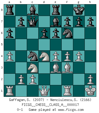 Last move : 0-1 2007 June 30 3:20:6 [Event "FICGS__CHESS__CLASS_A__000017"] [Site "FICGS"] [Date "2007.03.05"] [Round "1"] [White "Gaffagan,Steven"] [Black "Nenciulescu,Silviu"] [Result "0-1"] [WhiteElo "2037"] [BlackElo "2166"] 1.e4 c5 2.Nf3 d6 3.d4 cxd4 4.Nxd4 Nf6 5.Nc3 a6 6.Be2 e6 7.f4 Be7 8.O-O Nc6 9.Be3 O-O 10.a4 Qc7 11.Kh1 Re8 12.Bf3 Na5 13.g4 Nc4 0-1 This chess game has been lost on time (started : 2007.03.05 3:0:44) Sicilian : Najdorf, Opovcensky variation Kingside Castling by player White (move 8) Kingside Castling by player Black (move 9) Player Black won this chess game. Follow this game move after move (download)The Chess pieces are the block alphabet which shapes thoughts; and these thoughts, although making a visual design on the chessboard, express their beauty abstractly, like a poem. (Marcel Duchamp) Ich bin es gewohnt, das die Jugend mir überhaupt keinen Respekt entgegenbringt. (Alexander Morozewich) El tablero es el mundo, las piezas es el fenomeno del universo, las reglas del juego son lo que llamamos leyes de la naturaleza y el jugador del lado opuesto, se encuentra oculto a nuestra vista. (Thomas Huxley) La tactique, c'est ce que vous faites quand il y a quelque chose à faire; la stratégie, c'est ce que vous faites quand il n'y a rien à faire. (Savielli Tartacower) Horse racing is animated roulette. (Roger Kahn)