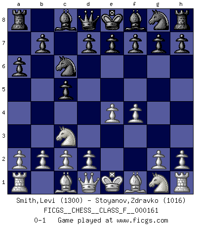 Last move : 0-1 2015 July 31 7:16:34 [Event "FICGS__CHESS__CLASS_F__000161"] [Site "FICGS"] [Date "2015.06.20"] [Round "1"] [White "Smith,Levi"] [Black "Stoyanov,Zdravko"] [Result "0-1"] [WhiteElo "1300"] [BlackElo "1016"] 1.e4 c5 2.Nc3 a6 3.f4 Nc6 0-1 This chess game has been lost on time (started : 2015.06.20 11:38:53) Sicilian : Closed Player Black won this chess game. Follow this game move after move (download)The Pin is mightier than the sword. (Fred Reinfeld) Viele Opfer benötigen überhaupt keine konkrete Berechnung. Es genügt sich die entstehende Position kurz vorzustellen, um uns davon zu überzeugen, dass das Opfer korrekt ist. (Mikhail Nekhemyevich Tal) Juega la Apertura como un libro, el Juego Medio como un mago y los Finales como una máquina. (Spielmann) À la honte des hommes, on sait que les lois du jeu sont les seules qui soient partout justes, claires, inviolables et exécutées. Pourquoi l'Indien qui a donné les règles du jeu d'échecs est-il obéi de bon gré dans toute la terre, et que les décrétales des papes, par exemple, sont aujourd'hui un objet d'horreur et de mépris ? C'est que l'inventeur des échecs combina tout avec justesse pour la satisfaction des joueurs, et que les papes, dans leurs décrétales, n'eurent en vue que leur seul avantage. L'Indien voulut exercer également l'esprit des hommes et leur donner du plaisir; les papes ont voulu abrutir l'esprit des hommes. Voltaire (Dictionnaire philosophique / Garnier 1967) The age of a woman doesn't mean a thing. The best tunes are played on the oldest fiddles. (Ralph Waldo Emerson)