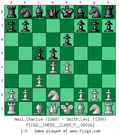 Last move : 1-0 2015 July 31 7:16:34 [Event "FICGS__CHESS__CLASS_F__000161"] [Site "FICGS"] [Date "2015.06.20"] [Round "1"] [White "Neil,Charlie"] [Black "Smith,Levi"] [Result "1-0"] [WhiteElo "1068"] [BlackElo "1300"] 1.e4 e6 2.d4 d5 3.Nd2 c5 4.c3 1-0 This chess game has been lost on time (started : 2015.06.20 11:38:53) French : Tarrasch, Open variation Player White won this chess game. Follow this game move after move (download)It is no time to be playing Chess when the house is on fire. (Italian Proverb) Alle Schachspieler sollten auch ein Hobby haben. (Savielly Grigorievitsch Tartakower) El ganador de una partida es aquel jugador que hace el penúltimo error. (Savielly Tartakover) Les Echecs, c'est l'art de la guerre sans les charniers, c'est la résurrection des morts tombés au champ d'honneur, l'espoir perpétuel, la suprématie de l'intelligence sur la force, la culture de l'esprit. (F. Szpiner) Those who make the worst use of their time are the first to complain of its brevity. (Jean de la Bruyere)