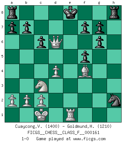 Last move : 1-0 2015 July 26 3:46:22 [Event "FICGS__CHESS__CLASS_F__000161"] [Site "FICGS"] [Date "2015.06.20"] [Round "1"] [White "Cuaycong,Virgilio"] [Black "Goldmund,Heike"] [Result "1-0"] [WhiteElo "1400"] [BlackElo "1210"] 1.e4 d5 2.exd5 Qxd5 3.Nc3 Qa5 4.d4 Nf6 5.Nf3 Bf5 6.Bc4 e6 7.Bd2 c6 8.Qe2 Qc7 9.O-O-O Nbd7 10.Ne5 Bd6 11.g4 Bg6 12.f4 Nb6 13.f5 exf5 14.Nxg6 Be7 15.Bf4 hxg6 16.Bxc7 Nxc4 17.Qxc4 Nxg4 18.Rde1 Kd7 19.Rxe7+ Kxe7 20.Qc5+ Kd7 21.Bf4 Nxh2 22.Qd6+ Ke8 23.Re1+ 1-0 Scandinavian defense Queenside Castling by player White (move 9) Player White won this chess game. Follow this game move after move (download)The older I grow, the more I value pawns. (Paul Keres) Ich verachte Kasparow. (Viktor Kortschnoi) Yo no le temo a Spassky. Todos saben que yo soy el mejor. Uno no necesita un torneo para probarlo. (Bobby Fischer) Karpov est une pièce de musée. (Garry Kasparov) Luck never made a man wise. (Seneca, Letters to Lucilius)