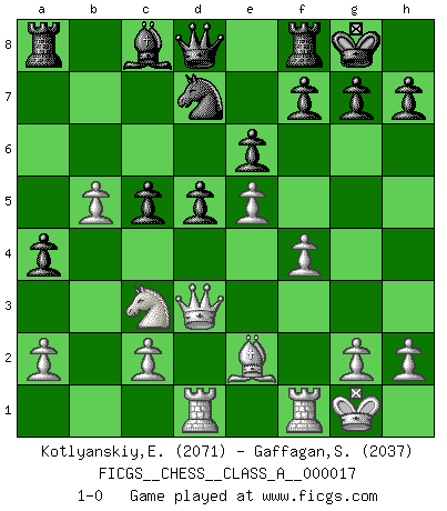 Last move : 1-0 2007 June 9 6:49:23 [Event "FICGS__CHESS__CLASS_A__000017"] [Site "FICGS"] [Date "2007.03.05"] [Round "1"] [White "Kotlyanskiy,Edward"] [Black "Gaffagan,Steven"] [Result "1-0"] [WhiteElo "2071"] [BlackElo "2037"] 1.e4 e6 2.d4 d5 3.Nc3 Nf6 4.e5 Nfd7 5.f4 c5 6.Nf3 Nc6 7.Be3 a6 8.Be2 cxd4 9.Nxd4 Bc5 10.Nxc6 bxc6 11.Bxc5 Nxc5 12.Qd4 Nd7 13.b4 a5 14.b5 c5 15.Qd3 a4 16.O-O O-O 17.Rad1 1-0 This chess game has been lost on time (started : 2007.03.05 3:0:44) French : Steinitz, Boleslavsky variation Kingside Castling by player White (move 16) Kingside Castling by player Black (move 16) Player White won this chess game. Follow this game move after move (download)When you don't know what to play, wait for an idea to come into your opponent's mind. You may be sure that idea will be wrong. (Siegbert Tarrasch) Das Schachspiel ist ein See, in welchem eine Mücke baden und ein Elefant ertrinken kann. (Emanuel Lasker) Fischer era un maestro de claridad y un Rey del posicionamiento astuto. Sus oponentes podían ver hacia donde se dirigía pero eran impotentes para detenerlo. (Bruce Pandolfini) Les échecs sont un jeu par leur forme, un art par leur essence et une science par sa difficulté d'acquisition. Ils peuvent vous procurer autant de plaisir qu'un bon livre ou une belle musique, mais vous n'aurez une réelle joie que si vous arrivez à bien jouer. (Tigran Petrosian) The difference between perseverance and obstinacy is that one comes from a strong will, and the other from a strong won't. (Henry Ward Beecher)