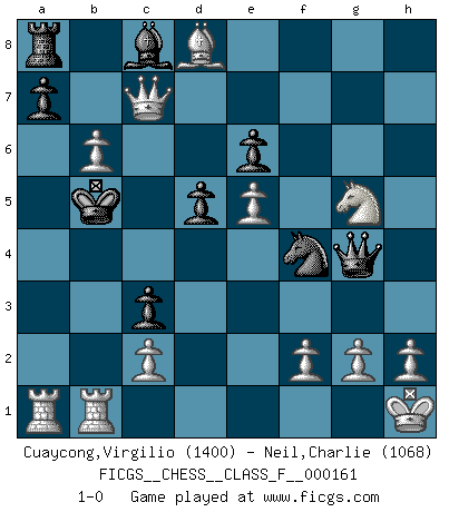Last move : 1-0 2015 July 16 22:7:26 [Event "FICGS__CHESS__CLASS_F__000161"] [Site "FICGS"] [Date "2015.06.20"] [Round "1"] [White "Cuaycong,Virgilio"] [Black "Neil,Charlie"] [Result "1-0"] [WhiteElo "1400"] [BlackElo "1068"] 1.e4 e6 2.d4 d5 3.Nc3 Bb4 4.e5 c5 5.a3 Bxc3+ 6.bxc3 Ne7 7.Qg4 Rg8 8.Bd3 Nbc6 9.Bxh7 Rh8 10.Qxg7 Rxh7 11.Qxh7 cxd4 12.Nf3 Qa5 13.O-O dxc3 14.Ng5 Kd7 15.Qxf7 Kc7 16.a4 Qb4 17.Ba3 Qg4 18.Bd6+ Kb6 19.Bxe7 Nd4 20.Bd8+ Ka6 21.Qc7 Ne2+ 22.Kh1 b6 23.a5 Nf4 24.axb6 Kb5 25.Rfb1+ 1-0 French : Winawer, Advance, poisoned pawn variation Kingside Castling by player White (move 13) Player White won this chess game. Follow this game move after move (download)A passed Pawn increases in strength as the number of pieces on the board diminishes. (Capablanca) Dass jemand wie Surab Asmaiparaschwili, der selbst Elopunkte gekauft hat , Vize-Präsident der Fide werden konnte, sagt schon einges über den Zustand dieser Organisation aus. (Joel Lautier) La señal de un Gran Maestro es su habilidad de ganar una partida rápidamente y sin dolor. (Irving Chernev) L'action d'une oeuvre littéraire se déroule sur un champ de bataille. Les masques et les types du drame moderne correspondent aux pièces du jeu d'échecs. L'intrigue correspond aux coups et aux gambits, c'est à dire aux techniques du jeu telles qu'utilisées et interprétées par les joueurs. Les tactiques et les péripéties [mouvements] correspondent aux coups exécutés par l'adversaire. (Viktor Shklovsky) Quotation,n.: The act of repeating erroneously the words of another. The words erroneously repeated. (Ambrose Bierce, The Devil's Dictionary)