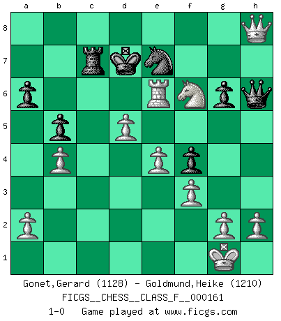 Last move : 1-0 2015 August 4 20:55:15 [Event "FICGS__CHESS__CLASS_F__000161"] [Site "FICGS"] [Date "2015.06.20"] [Round "1"] [White "Gonet,Gerard"] [Black "Goldmund,Heike"] [Result "1-0"] [WhiteElo "1128"] [BlackElo "1210"] 1.d4 Nf6 2.f3 d6 3.e4 Bd7 4.c4 g6 5.Nc3 Bg7 6.Be3 O-O 7.Bd3 e5 8.Nge2 Re8 9.d5 c6 10.O-O cxd5 11.Nxd5 Nc6 12.Qd2 b6 13.b4 Nxd5 14.cxd5 Ne7 15.Rac1 f5 16.Bh6 f4 17.Bxg7 Kxg7 18.Nc3 Ng8 19.Bb5 Bxb5 20.Nxb5 Re7 21.Rc6 Rc8 22.Rfc1 Rxc6 23.Rxc6 a6 24.Nxd6 Rd7 25.Nc4 b5 26.Nxe5 Rc7 27.Qc3 Ra7 28.Nd7 Kh6 29.Ne5 Ne7 30.Re6 Rc7 31.Qd2 Qf8 32.Ng4+ Kg7 33.Qd4+ Kg8 34.Nf6+ Kf7 35.Nxh7 Qh6 36.Qf6+ Ke8 37.Qh8+ Kd7 38.Nf6+ 1-0 Paleface attack Kingside Castling by player Black (move 6) Kingside Castling by player White (move 10) Player White won this chess game. Follow this game move after move (download)It is peculiar but a fact nevertheless, that gamblers in chess always have enthusiastic followers. (Botvinnik) Ich verstehe den Grund nicht, warum die Aufteilung in Frauen und Männer überhaupt im Schach besteht. (Judith Polgar) Cuando no sepas que mover, espera por una idea que se le venga a la la cabeza de tu oponente. Tenlo por seguro de que esa idea estará incorrecta. (Siegbert Tarrasch) Nous vivons dans un monde échiquéen : chaque jour qui passe est un défi à relever. (Philosophe Sasha) Good decisions come from experience, and experience comes from bad decisions. (Anonymous)
