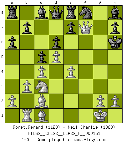 Last move : 1-0 2015 June 25 22:25:24 [Event "FICGS__CHESS__CLASS_F__000161"] [Site "FICGS"] [Date "2015.06.20"] [Round "1"] [White "Gonet,Gerard"] [Black "Neil,Charlie"] [Result "1-0"] [WhiteElo "1128"] [BlackElo "1068"] 1.d4 Nf6 2.f3 c5 3.d5 d6 4.c4 g6 5.Nc3 a6 6.e4 Bg7 7.Bd3 Nbd7 8.Nge2 Ne5 9.O-O Nfd7 10.b3 O-O 11.Bc2 Nb6 12.f4 Ned7 13.Bb2 Re8 14.Rb1 Nf8 15.Ng3 Nbd7 16.f5 gxf5 17.Nxf5 Bh8 18.Nh6+ Kg7 19.Qh5 Ne5 20.Rxf7+ Nxf7 21.Qxf7+ Kxh6 22.Bc1+ 1-0 Paleface attack Kingside Castling by player White (move 9) Kingside Castling by player Black (move 10) Player White won this chess game. Follow this game move after move (download)Botvinnik tried to take the mystery out of Chess, always relating it to situations in ordinary life. He used to call Chess a typical inexact problem similar to those which people are always having to solve in everyday life. (Garry Kasparov) Die Neutralität betrachte ich als eine schwere Krankheit. (Viktor Kortschnoi) Aquel que teme a un Peón de Reina aislado, debería de retirarse del Ajedrez. (Siegbert Tarrasch) Assurément je connaissais par expérience le mystérieux attrait de ce jeu royal, le seul entre tous les jeux inventés par les hommes qui échappe souverainement à la tyrannie du hasard, le seul où l'on ne doive sa victoire qu'à son intelligence ou plutôt à une certaine forme d'intelligence. Mais n'est-ce pas déjà le limiter injurieusement que d'appeler les échecs un jeu ? N'est-ce pas une science, un art ou quelque chose qui, comme le cercueil de Mahomet entre ciel et terre, est suspendu entre l'un et l'autre, et qui réunit un nombre incroyable de contraires ? [...] C'est une pensée qui ne mène à rien, une mathématique qui n'établit rien, un art qui ne laisse pas d'uvre, une architecture sans matière; et il l'a prouvé néanmoins qu'il était plus durable, à sa manière, que les livres ou que tout autre monument, ce jeu unique qui appartient à tous les peuples et à tous les temps, et dont personne ne sait quel dieu en fit don à la terre pour tuer l'ennui, pour aiguiser l'esprit et stimuler l'âme. Où commence-t-il, où finit-il ? (Stefan Zweig) In my experience, there's no such thing as luck. (Obi-Wan Kenobi in Star Wars ep.4)