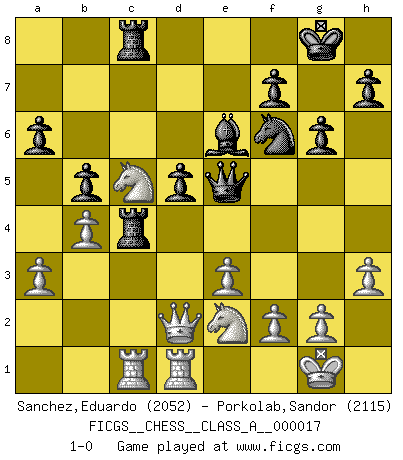 Last move : 1-0 2007 November 23 19:34:2 [Event "FICGS__CHESS__CLASS_A__000017"] [Site "FICGS"] [Date "2007.03.05"] [Round "1"] [White "Sanchez,Eduardo"] [Black "Porkolab,Sandor"] [Result "1-0"] [WhiteElo "2052"] [BlackElo "2115"] 1.d4 d5 2.Nf3 Nf6 3.c4 c6 4.Qc2 e6 5.cxd5 cxd5 6.Nc3 Nc6 7.Bf4 Bd6 8.Bxd6 Qxd6 9.e3 O-O 10.Be2 Bd7 11.O-O Rfc8 12.Rac1 a6 13.a3 Rc7 14.Rfd1 Rac8 15.Bd3 e5 16.dxe5 Nxe5 17.Nd4 Neg4 18.Nf3 g6 19.h3 Ne5 20.Be2 b5 21.Qd2 Nc4 22.Bxc4 Rxc4 23.b3 R4c6 24.Nd4 R6c7 25.b4 Rc4 26.Nb3 Qe5 27.Nc5 Be6 28.Ne2 1-0 This chess game has been lost on time (started : 2007.03.05 3:0:44) Queen's pawn game Kingside Castling by player Black (move 9) Kingside Castling by player White (move 11) Player White won this chess game. Follow this game move after move (download)You need not play well - just help your opponent to play badly. (Genrikh Chepukaitis) Ich hatte meine größten Erfolge, als ich 47 Jahre alt war. Kasparow war noch nicht mal 42 und hat das Schach schon im Stich gelassen. (Viktor Kortschnoi) Bobby es la celebridad menos entendida y malinterpretada que camina el la faz de esta tierra. (Yasser Seirawan) Les sacrifices démontrent seulement que quelqu'un a gaffé. (Savielly Tartacover) When a man with money meets a man with experience, the man with experience leaves with money and the man with money leaves with experience. (Anonymous)