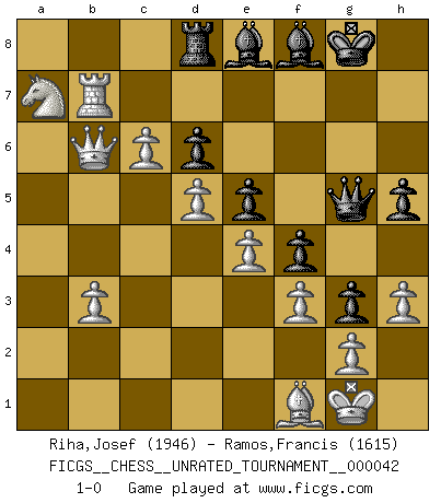 Last move : 1-0 2015 July 19 14:18:22 [Event "FICGS__CHESS__UNRATED_TOURNAMENT__000042"] [Site "FICGS"] [Date "2015.06.22"] [Round "1"] [White "Riha,Josef"] [Black "Ramos,Francis"] [Result "1-0"] [WhiteElo "1946"] [BlackElo "1615"] 1.d4 Nf6 2.c4 g6 3.Nc3 Bg7 4.e4 d6 5.Nf3 O-O 6.Be2 Nc6 7.O-O e5 8.d5 Ne7 9.b4 a5 10.bxa5 Rxa5 11.Qb3 Nd7 12.Qb4 b6 13.Nb5 Nc5 14.Bg5 h6 15.Bxe7 Qxe7 16.Nc3 f5 17.Nd2 g5 18.f3 f4 19.Rfc1 h5 20.Nb5 g4 21.Nb3 Nxb3 22.axb3 Rxa1 23.Rxa1 g3 24.h3 Qh4 25.Bf1 Qd8 26.Ra8 Qe7 27.Ra7 Rd8 28.Rxc7 Qf6 29.Na7 Bd7 30.Qxb6 Bf8 31.c5 Be8 32.Rb7 Qg5 33.c6 1-0 King's Indian : 6.Be2 Kingside Castling by player Black (move 5) Kingside Castling by player White (move 7) Player White won this chess game. Follow this game move after move (download)If one piece is badly posted, the whole game is bad. (Tarrasch) Vielleicht wirkt die Aura früherer Spieler glanzvoller als die der heutigen Spieler, aber das liegt daran, dass man kein Programm wie Fritz hatte, das einem all die Löcher in ihren Partien zeigt. (Vladimir Kramnik) Después de una mala apertura, hay una esperanza en el juego medio. Pero una vez que estas en finales, el momento de la verdad ha llegado. (Edmar Mednis) 'L'échange des dames est un coup dur pour les deux adversaires...' Un journaliste lors d'une partie du match Spassky-Fischer Now you put water in a cup, it becomes the cup; You put water into a bottle it becomes the bottle; You put it in a teapot it becomes the teapot. Water can flow or it can crash. Be water, my friend. (Bruce Lee)