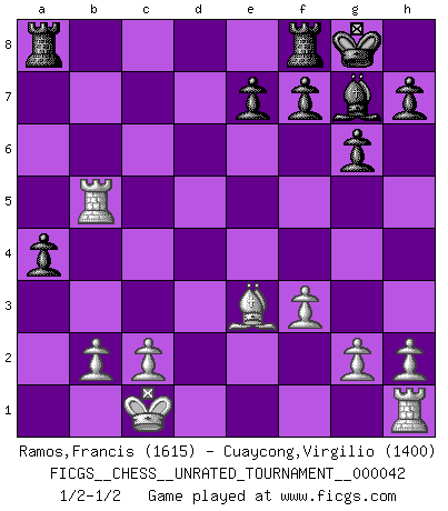 Last move : 1/2-1/2 2015 July 23 15:49:30 [Event "FICGS__CHESS__UNRATED_TOURNAMENT__000042"] [Site "FICGS"] [Date "2015.06.22"] [Round "1"] [White "Ramos,Francis"] [Black "Cuaycong,Virgilio"] [Result "1/2-1/2"] [WhiteElo "1615"] [BlackElo "1400"] 1.e4 c5 2.Nf3 Nc6 3.d4 cxd4 4.Nxd4 g6 5.Nc3 Bg7 6.Be3 Nf6 7.Qd2 d6 8.O-O-O O-O 9.f3 d5 10.Nxc6 bxc6 11.exd5 Nxd5 12.Nxd5 cxd5 13.Qxd5 Qxd5 14.Rxd5 a5 15.a4 Bf5 16.Bd3 Be6 17.Rb5 Bd7 18.Rb7 Bxa4 19.Bb5 Bxb5 20.Rxb5 a4 1/2-1/2 Sicilian : Accelerated Fianchetto, Modern variation Queenside Castling by player White (move 8) Kingside Castling by player Black (move 8) This chess game ended in a draw. Follow this game move after move (download)In Chess, at least, the brave inherit the earth. (Edmar Mednis) Strategie ist, wie man ein Mädchen auf den Rücksitz bekommt. Taktik ist, was man tut, wenn man dann dort ist. (Anonymous) Una de estas pequeñas movidas modestas pudieran ser mas molestas a tu oponente que la amenaza mas grande. (Siegbert Tarrasch) Les Echecs ne sont pas pour les âmes timides. Ils requièrent un homme entier, qui ne s'arrête pas aveuglément à ce qui a été déjà établi, mais qui tente individuellement de sonder les profondeurs du jeu. (W. Steinitz) The Movers & Shakers of this world are those who play chess in the mornings and go to the disco in the evenings. (Dinesh De Silva)