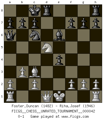 Last move : 0-1 2015 June 29 18:0:17 [Event "FICGS__CHESS__UNRATED_TOURNAMENT__000042"] [Site "FICGS"] [Date "2015.06.22"] [Round "1"] [White "Foster,Duncan"] [Black "Riha,Josef"] [Result "0-1"] [WhiteElo "1482"] [BlackElo "1946"] 1.e4 Nc6 2.d4 d5 3.exd5 Qxd5 4.Nf3 e5 5.Nc3 Bb4 6.Bd2 Bxc3 7.Bxc3 e4 8.Nd2 Be6 9.Nc4 Nf6 10.Ne3 Qg5 11.Bb5 Qxb5 12.b3 Qa6 13.d5 Nxd5 14.Nxd5 O-O-O 0-1 KP : Nimzovich defense Queenside Castling by player Black (move 14) Player Black won this chess game. Follow this game move after move (download)Why must I lose to this idiot ? (Aron Nimzovich) Versuche, dich von der Sklaverei der Eröffnungsvarianten zu befreien. Stattdessen soll man gewisse Typenpositionen erlernen, die man eingehend analysiert. (Aaron Nimzowitsch) El jugador táctico sabe que hacer cuando hay algo que hacer; mientras que el estratega sabe que hacer cuando no hay nada que hacer. (Gerald Abrahams) Il n'y a plus de joueurs du niveau de Jacob Murray dont la seule quête est le beau jeu, le plaisir de voir les pièces construire quelque chose. Sur 10 idées à la minute, 9 seront sans intérêt, la dernière s'avèrera géniale. (Christian Bauer) History is a gallery of pictures in which there are few originals and many copies. (Alexis de Tocqueville)